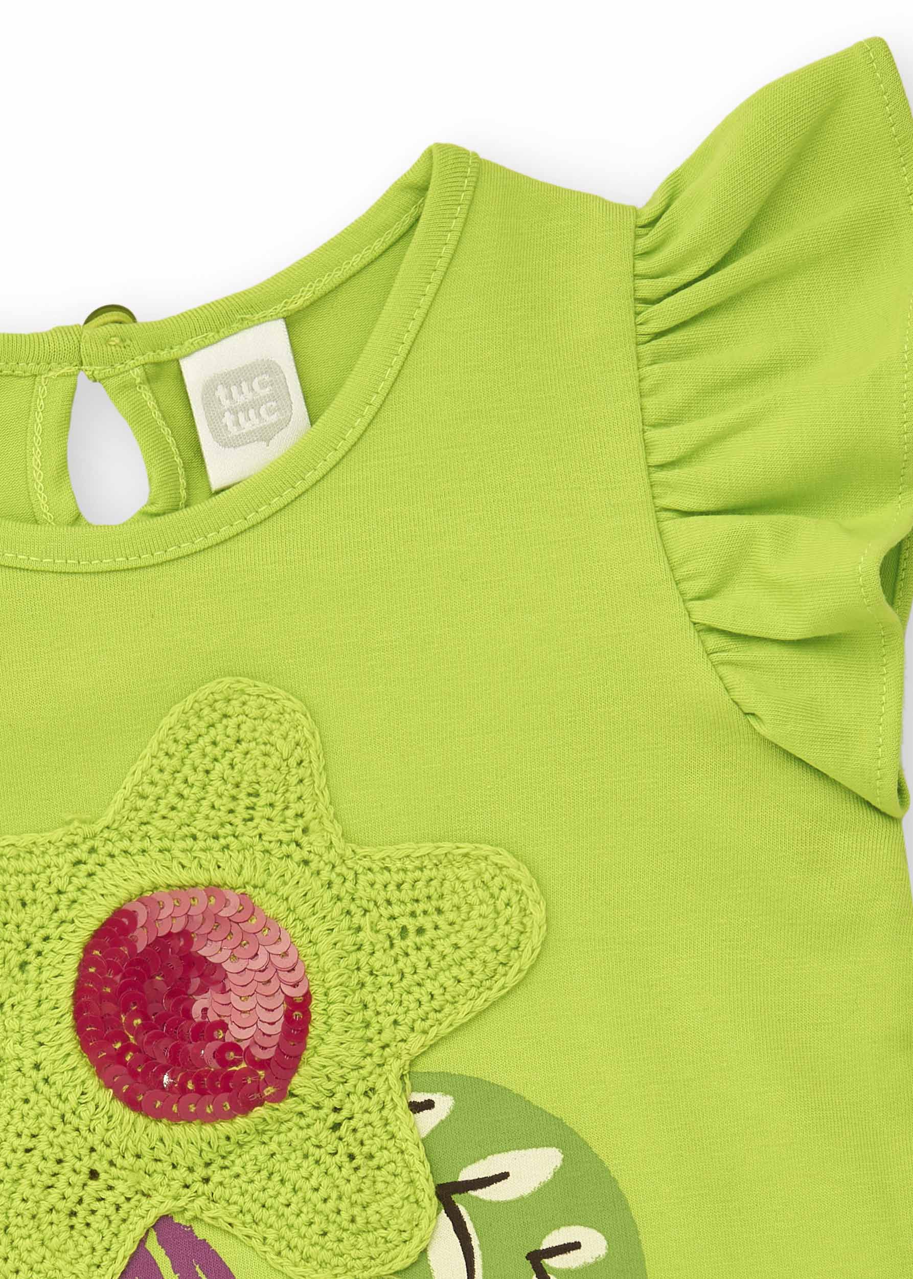 Tuc Tuc T-shirt for newborns, made of soft green cotton jersey, perfect for the spring-summer season. The short-sleeved model is enriched by elegant ruffles on the shoulders and a refined floral crochet application, embellished with sequins and rhinestones that give a bright and feminine touch to the look. Comfortable and light, this t-shirt is ideal to accompany your little girl at any time of the day, easily paired with skirts, shorts or overalls for a cheerful and detailed outfit.