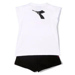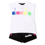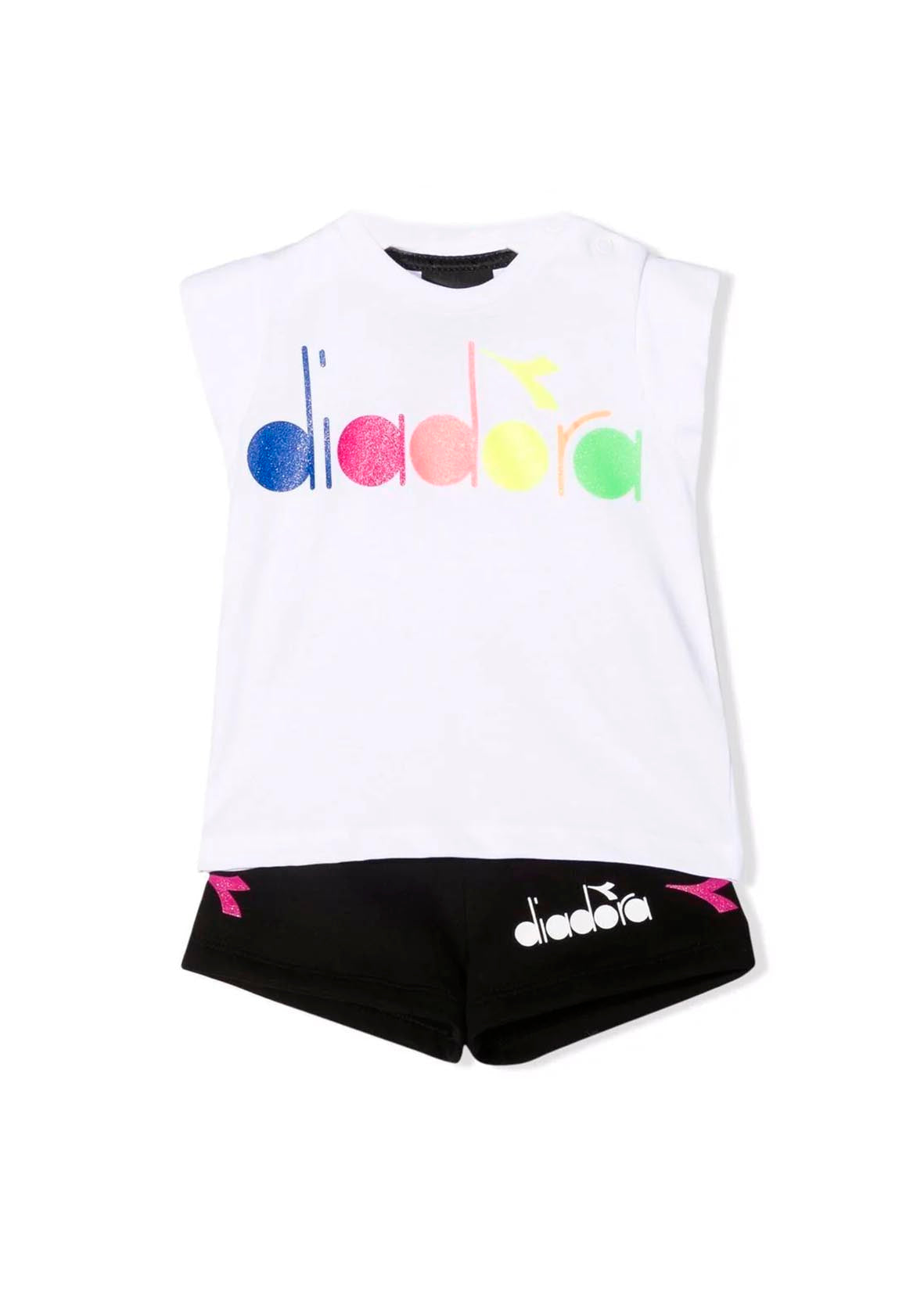 Diadora cotton tracksuit sportswear set: White crew neck T-shirt, armholes, multicoloured glitter print on the front. Black shorts, elasticated waist and contrasting side bands.