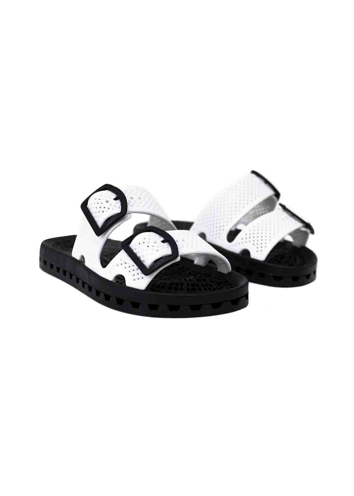 The Black Fluo White Double Band Children's Sandal by Sensi Kids, available on Florence Kids, combines elegance and practicality. Made of soft white rubber, it features adjustable buckles that guarantee a perfect fit. The simple and elegant design, enriched by a soft rubber finish, makes it versatile for any occasion, from casual to more sophisticated clothing. The non-slip sole and perforated tread make the sandal the ideal choice for the summer while the pull-on design makes it easy and practical to wear. It is ideal for wearing with a light dress or a more structured ensemble such as capri pants and a patterned blouse.