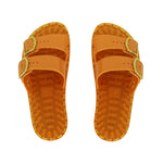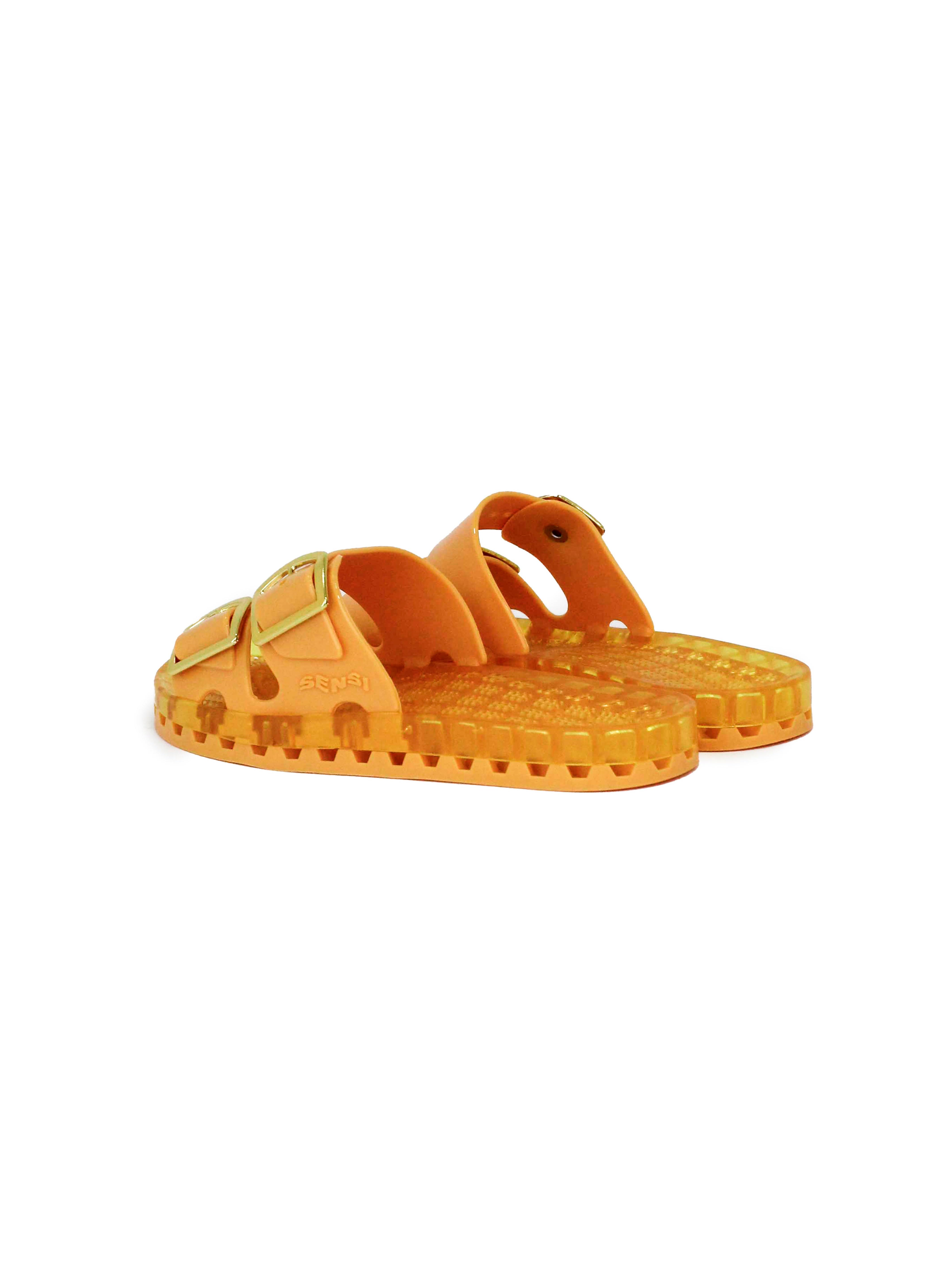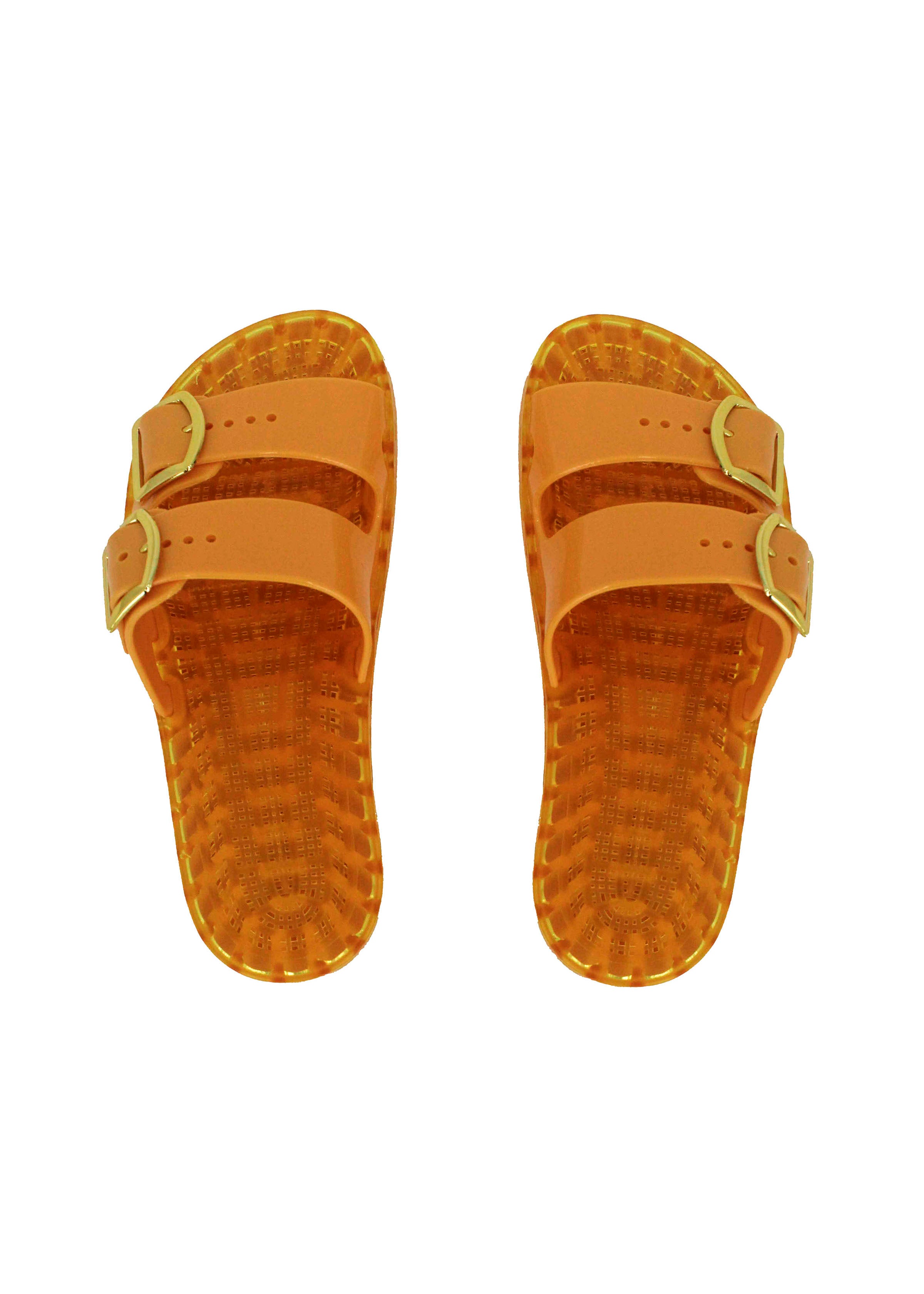 The Flamingo Mango Double Band Sandal for Children by Sensi Kids, available on Florence Kids, combines elegance and practicality. Made of soft mango-colored rubber, it features adjustable buckles that guarantee a perfect fit. The simple and elegant design, enriched by a soft rubber finish, makes it versatile for any occasion, from casual to more sophisticated clothing. The non-slip sole and perforated tread make the sandal the ideal choice for the summer while the pull-on design makes it easy and practical to wear. It is ideal for wearing with a light dress or a more structured ensemble such as capri pants and a patterned blouse.