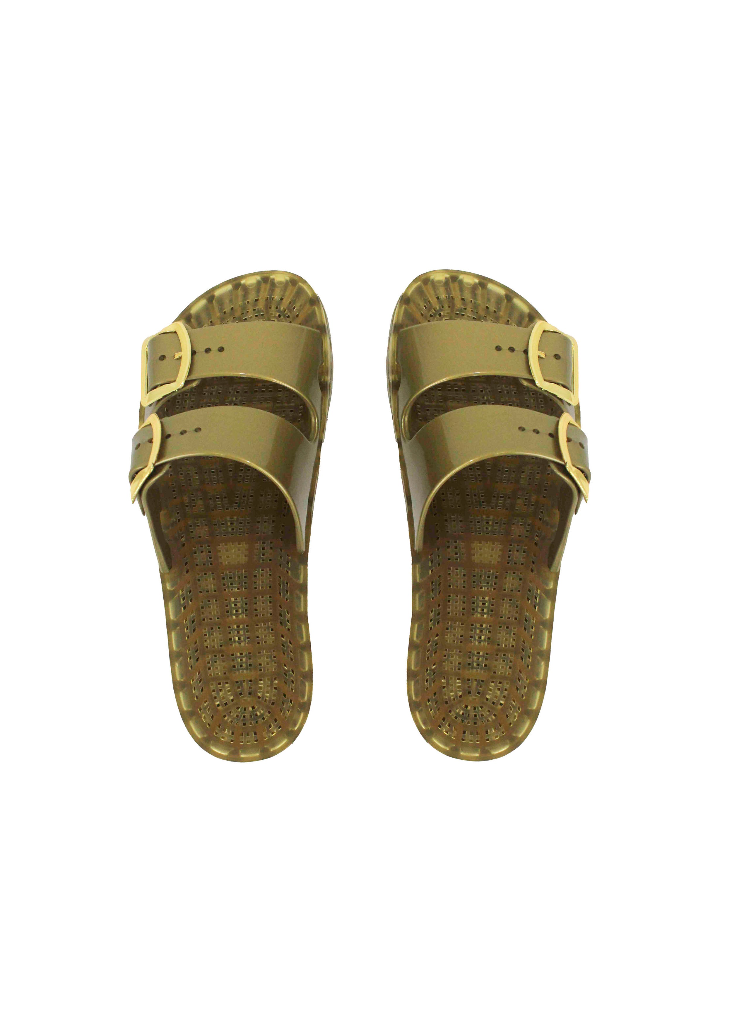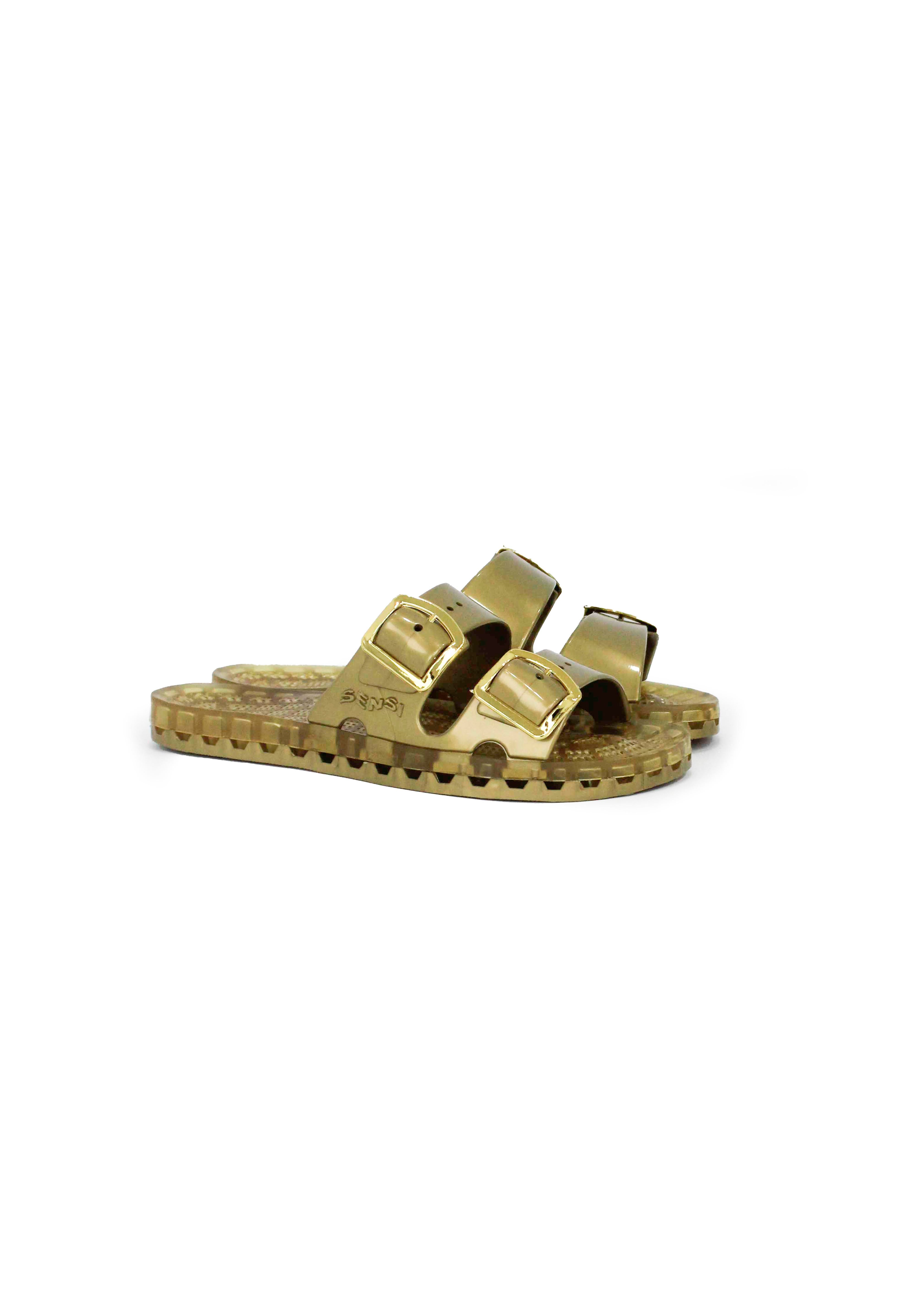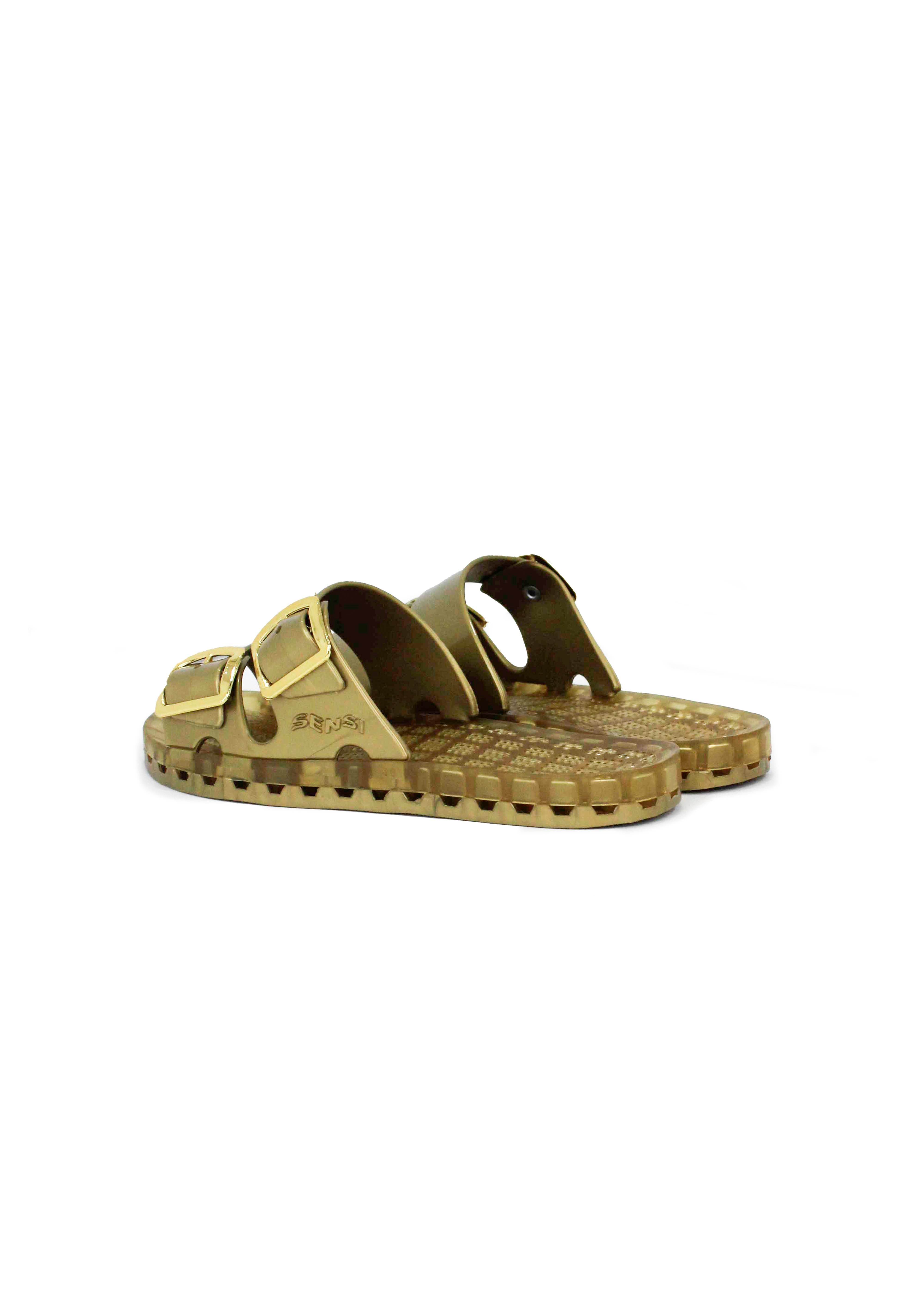 The Flamingo Gold Double Band Sandal for Children by Sensi Kids, available on Florence Kids, combines elegance and practicality. Made of soft gold-colored rubber, it features adjustable buckles that guarantee a perfect fit. The simple and elegant design, enriched by a soft rubber finish, makes it versatile for any occasion, from casual to more sophisticated clothing. The non-slip sole and perforated tread make the sandal the ideal choice for the summer while the pull-on design makes it easy and practical to wear. It is ideal for wearing with a light dress or a more structured ensemble such as capri pants and a patterned blouse.