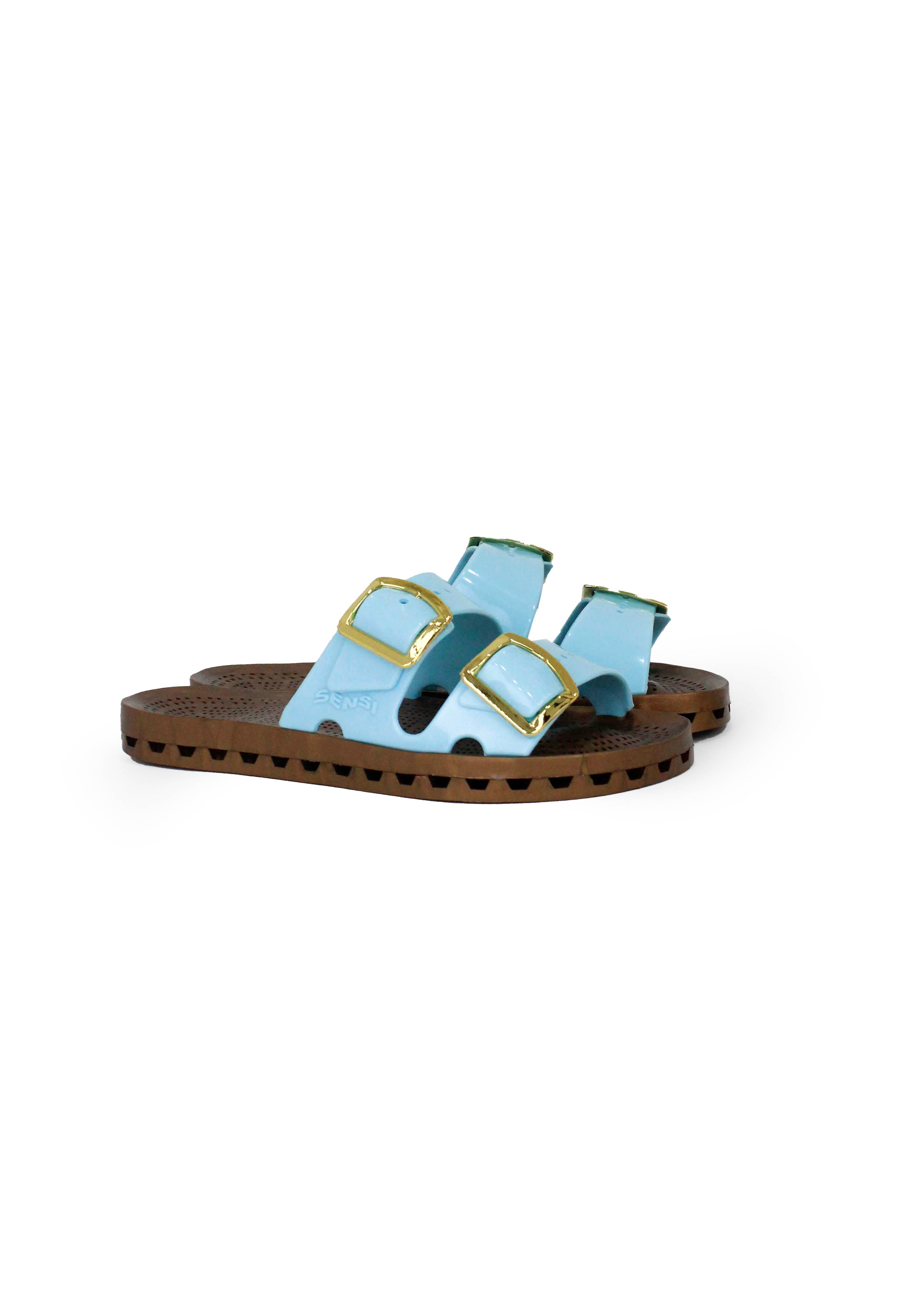 The Prestige double band light blue sandal for children by Sensi Kids, available on Florence Kids, combines elegance and practicality. Made of soft light blue rubber, it features adjustable buckles that guarantee a perfect fit. The simple and elegant design, enriched by a soft rubber finish, makes it versatile for any occasion, from casual to more sophisticated clothing. The non-slip sole and perforated tread make the sandal the ideal choice for the summer while the pull-on design makes it easy and practical to wear. It is ideal for wearing with a light dress or a more structured ensemble such as capri pants and a patterned blouse.