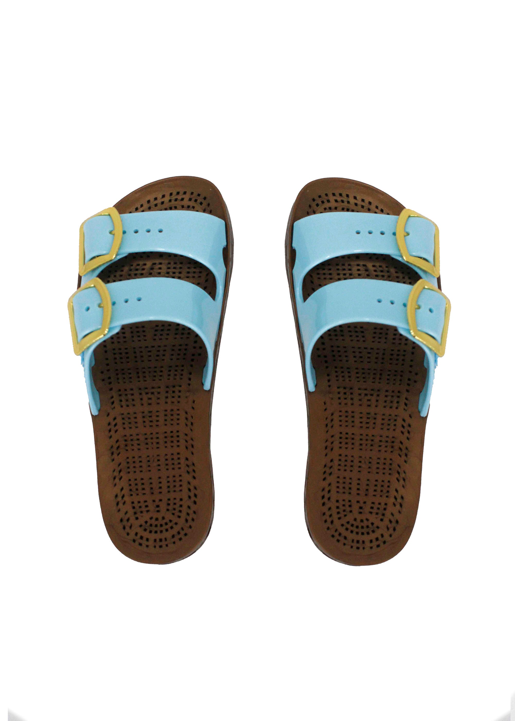 The Prestige Celeste Double Band Children's Sandal by Sensi Kids, available on Florence Kids, combines elegance and practicality. Made of soft light blue rubber, it features adjustable buckles that guarantee a perfect fit. The simple and elegant design, enriched by a soft rubber finish, makes it versatile for any occasion, from casual to more sophisticated clothing. The non-slip sole and perforated tread make the sandal the ideal choice for the summer while the pull-on design makes it easy and practical to wear. It is ideal for wearing with a light dress or a more structured ensemble such as capri pants and a patterned blouse.