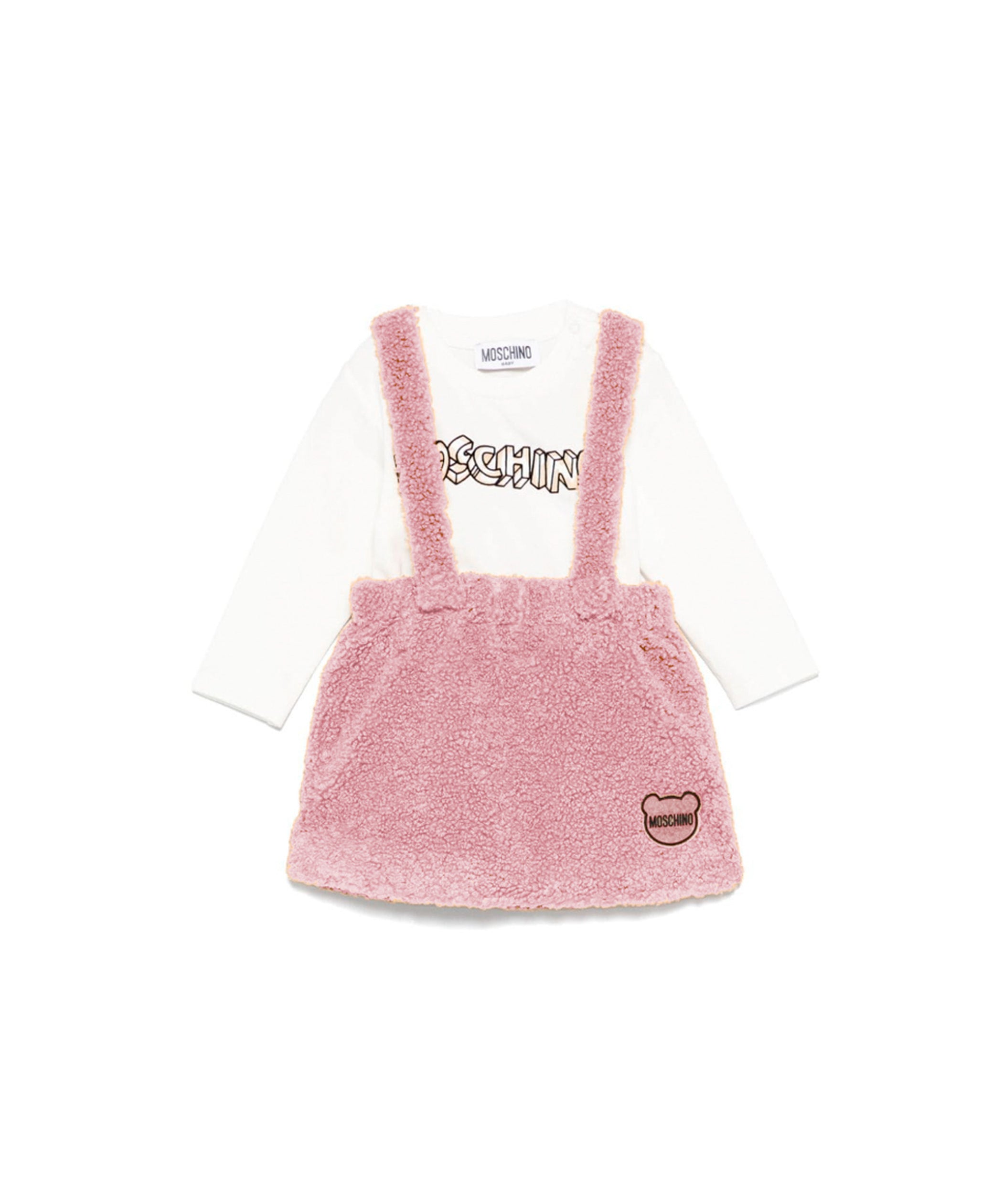 Moschino Kids Completo Gonna Salopette Peluche con T-shirt Panna per Neonate