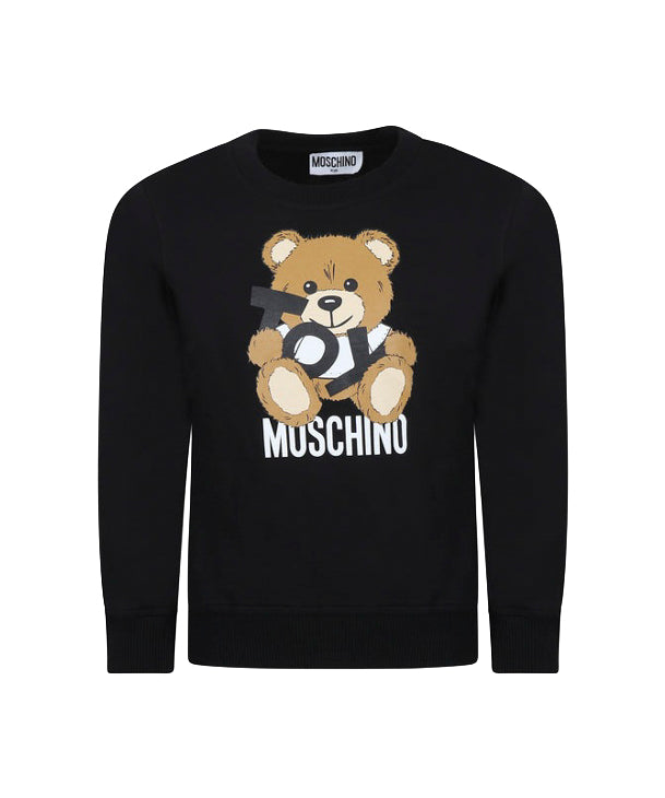 Felpa Moschino Kids nera con stampa Teddy Bear. Morbida e comoda, perfetta per look casual e divertenti.