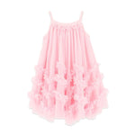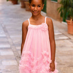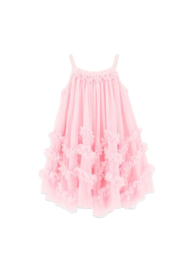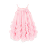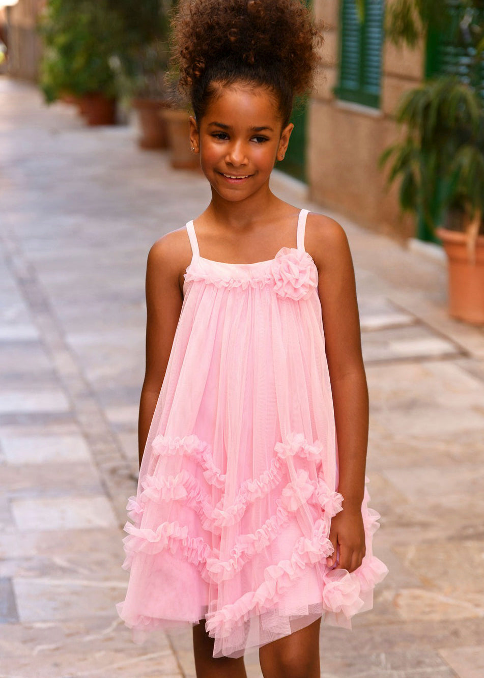 Adorable Angel's Face flowy dress for girls, crafted in a vibrant pink with layers of tulle that add volume and movement. This dress features a voluminous skirt enriched with a tone-on-tone zigzag ruffle detail at the hem, which adds a touch of style and originality to the look. The pretty tulle rosette at the neckline completes the design with a delicate and refined touch. Perfect for summer occasions or special events, this dress combines comfort, elegance and a unique design, making your little one feel like a princess.