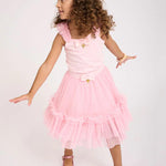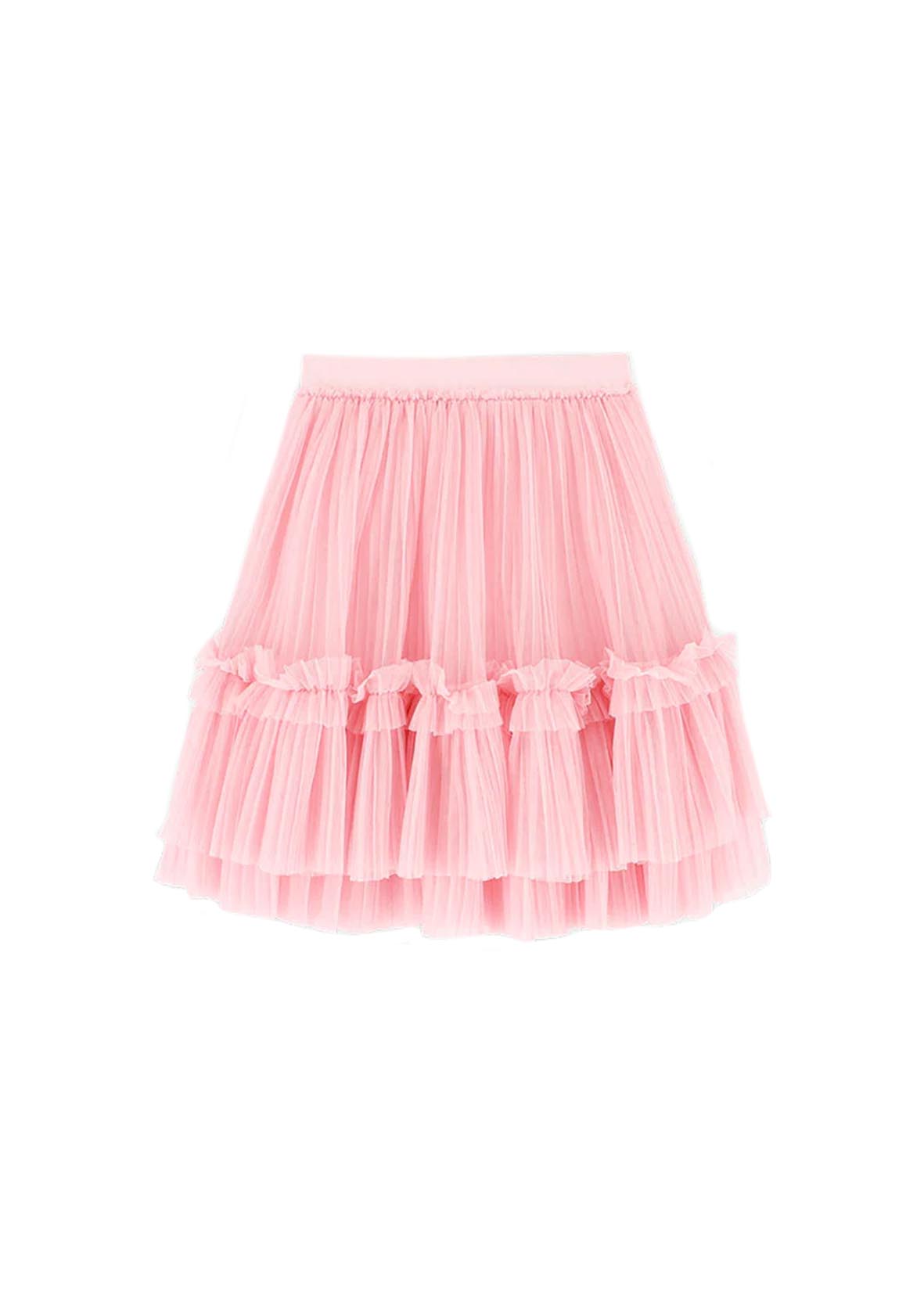 Perfectly pleated summer skirt for girls in fairy pink. Crafted from layers of soft, voluminous tulle, fully lined in a comfortable cotton blend, featuring an easy elastic waistband. The skirt is complete with our signature bow and heart charm at the centre waist. 100% Polyester. Lining: 50% Cotton 50% Modal Machine washable 30* Angel's Face signature bow and golden heart pendant Pretty pleated layered tulle Soft cotton lining Easy-to-pull elastic waistband