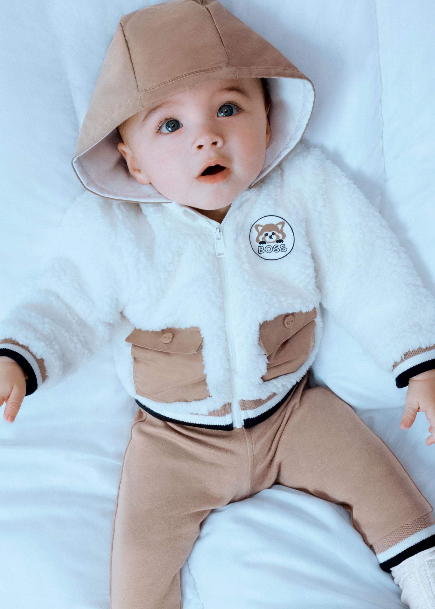 The BOSS Kids sweatshirt and pant set in white and biscuit, available from Florence Kids, is perfect for newborns who need comfort and style. Crafted from a cotton and faux shearling blend, this set offers softness and warmth, ideal for cooler days. The two-tone design adds a modern touch, while the jacket features a front zip fastening, a loose-fitting hood, and a logo patch for a distinctive look. Long sleeves and two side pockets with snap buttons add functionality. The matching trousers feature an elasticated waist for a comfortable fit and ribbed cuffs for a smart look. This set is ideal for keeping newborns warm and stylish.