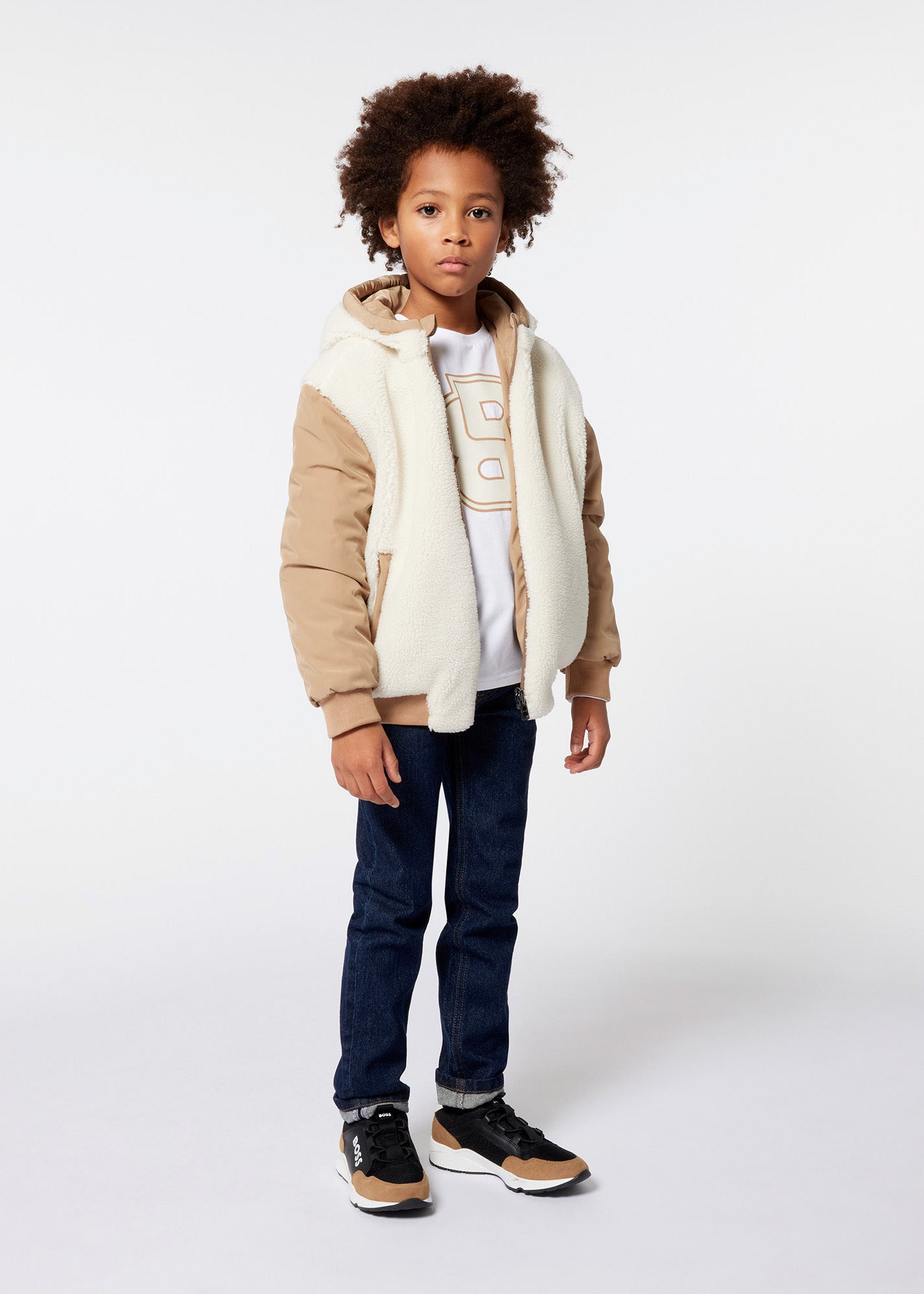 The BOSS Kids reversible jacket in biscuit, available at Florence Kids, is ideal for kids who want a mix of comfort and style. Crafted from cruelty-free shearling, this jacket offers warmth and a soft feel against the skin. The reversible design allows for easy changes of look, offering versatility for different occasions. Featuring a hood for extra protection against the cold, a front zip fastening and two practical side welt pockets. Long sleeves with a logo applique on the sleeve and a ribbed hem and cuffs complete the design, ensuring a snug and comfortable fit. Perfect for keeping kids warm and stylish during the colder seasons.
