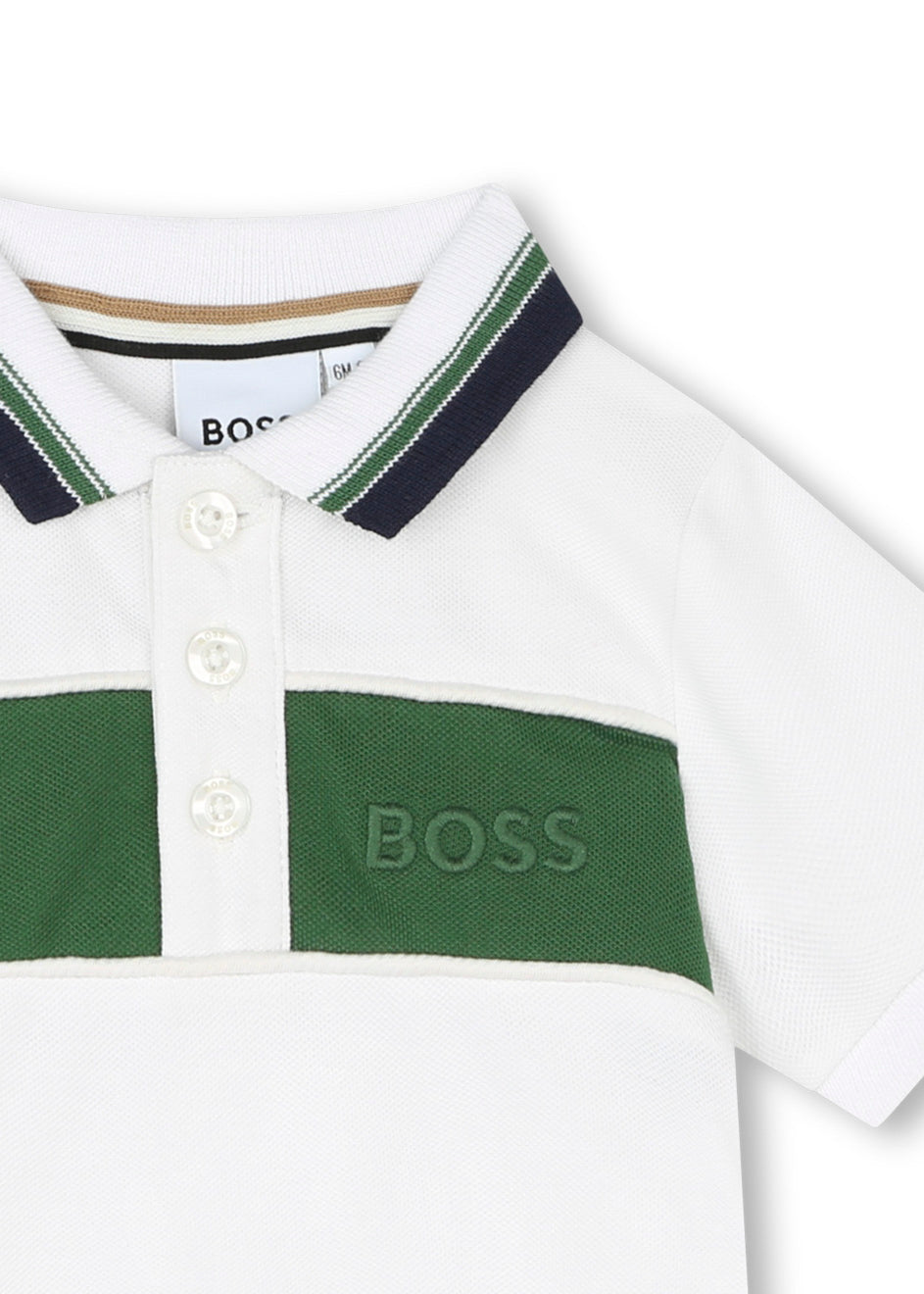 Add a touch of style to your child's collection with this white polo shirt from BOSS Kids, available at Florence Kids. Crafted from soft cotton, it offers comfort and freshness all day long. The green stripe adds a touch of vivacity, while the logo print on the chest completes the look with a touch of originality. With a classic crew neck and short sleeves, this polo shirt is perfect for stylish little ones who like a casual and lively style.