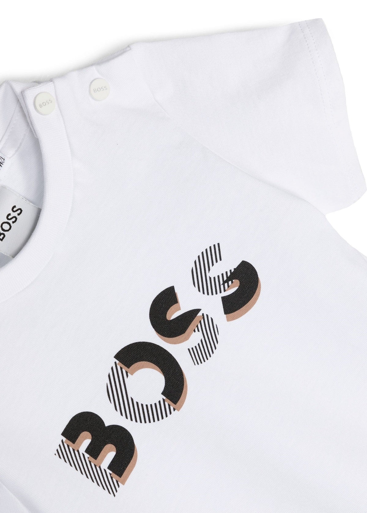 Add a touch of contemporary style to your baby's wardrobe with this white T-shirt from BOSS Kids. Crafted from soft cotton jersey, it offers all-day comfort and softness. The logo print on the front adds a touch of elegance, while the press stud fastening on the shoulder makes changing baby quick and easy. Complete with a classic crew neck and short sleeves, this T-shirt is perfect for any occasion.