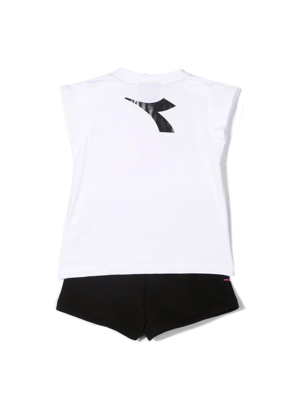Diadora cotton tracksuit sportswear set: White crew neck T-shirt, armholes, multicoloured glitter print on the front. Black shorts, elasticated waist and contrasting side bands.