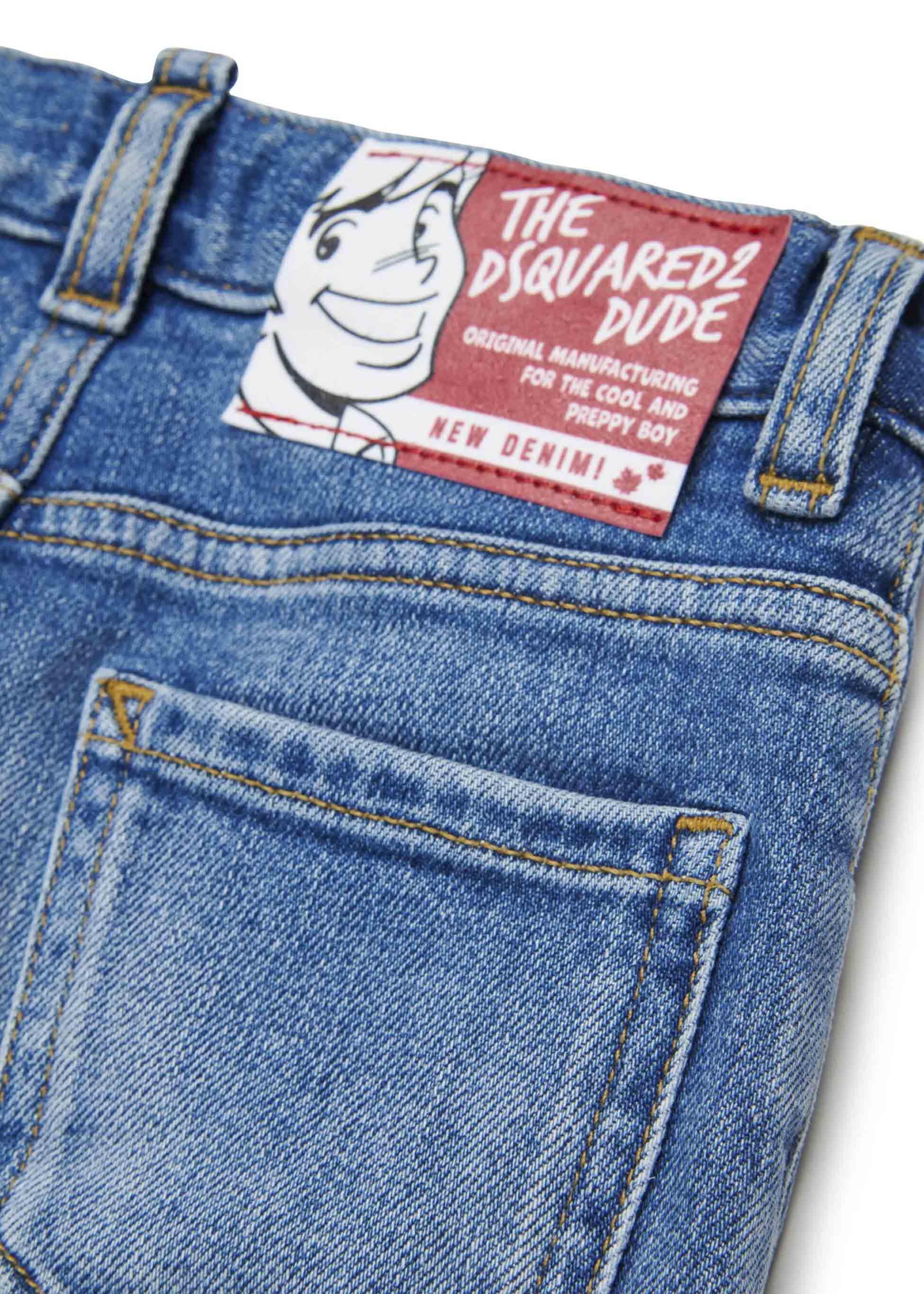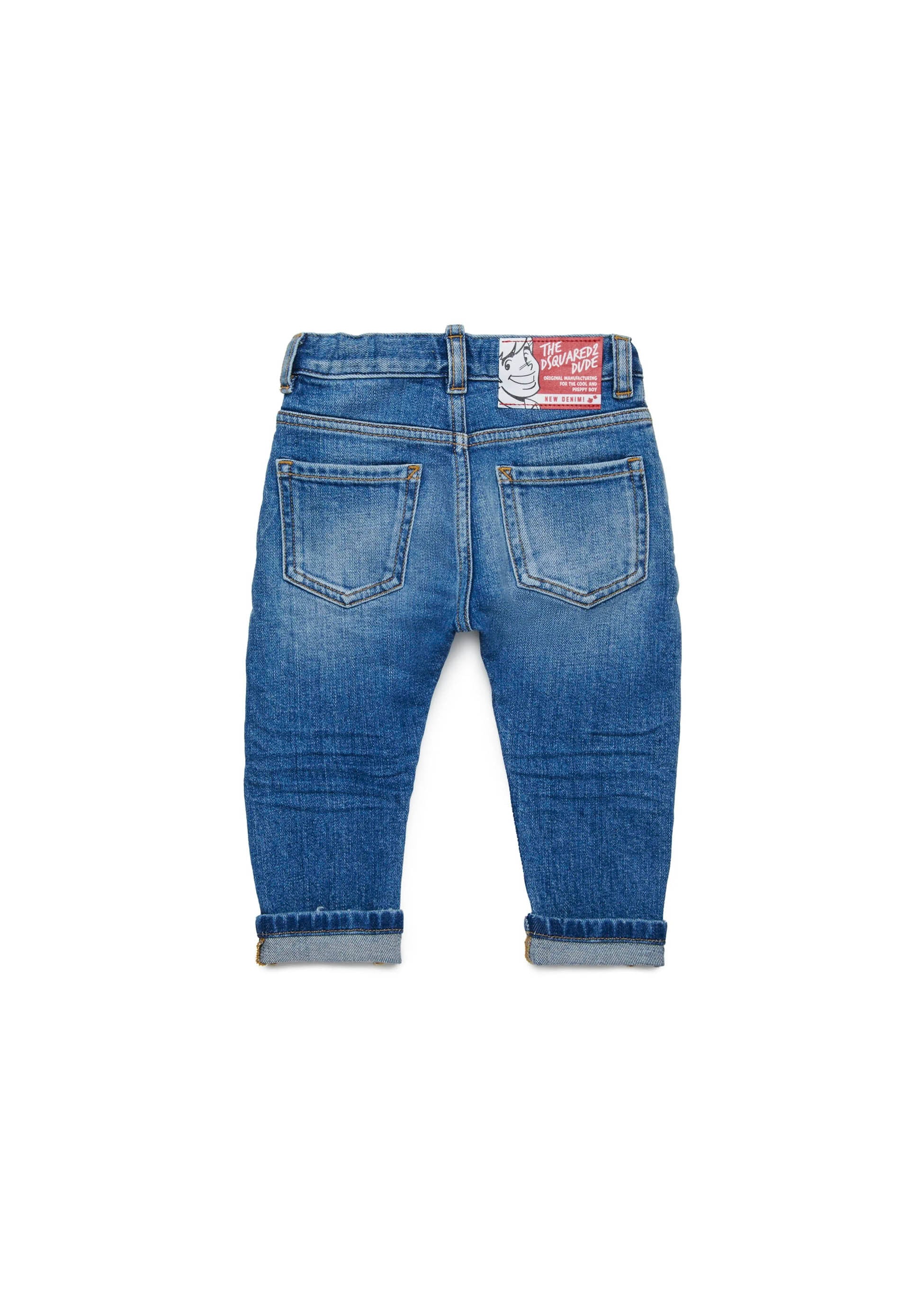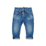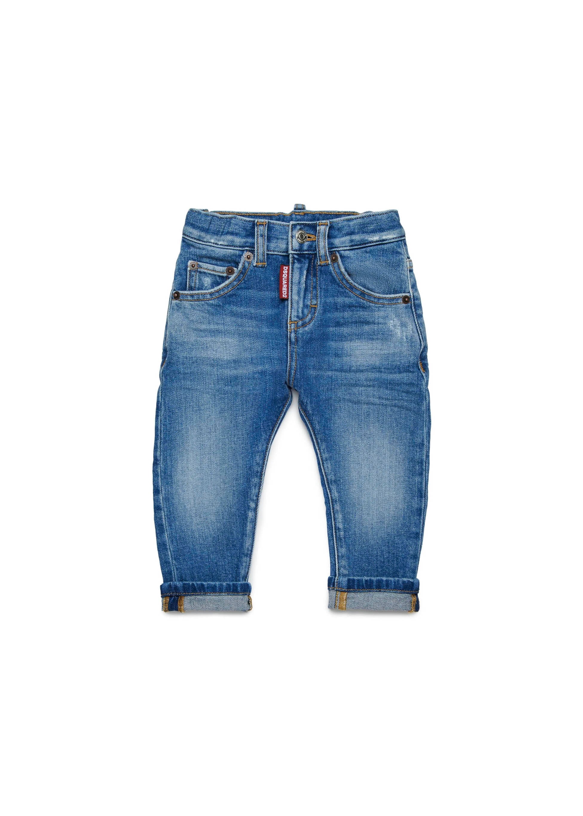 Add a touch of style and character to your baby's wardrobe with Dsquared2 denim jeans. Crafted from medium blue denim, these five-pocket jeans feature contrasting shades, whiskering and small abrasions for a trendy and modern look. The inside-out effect folded hem adds a distinctive detail, while the Dsquared2 flag logo label on the fly completes the design with an authentic touch. Perfect for a casual yet elegant look, these jeans are ideal for any occasion.