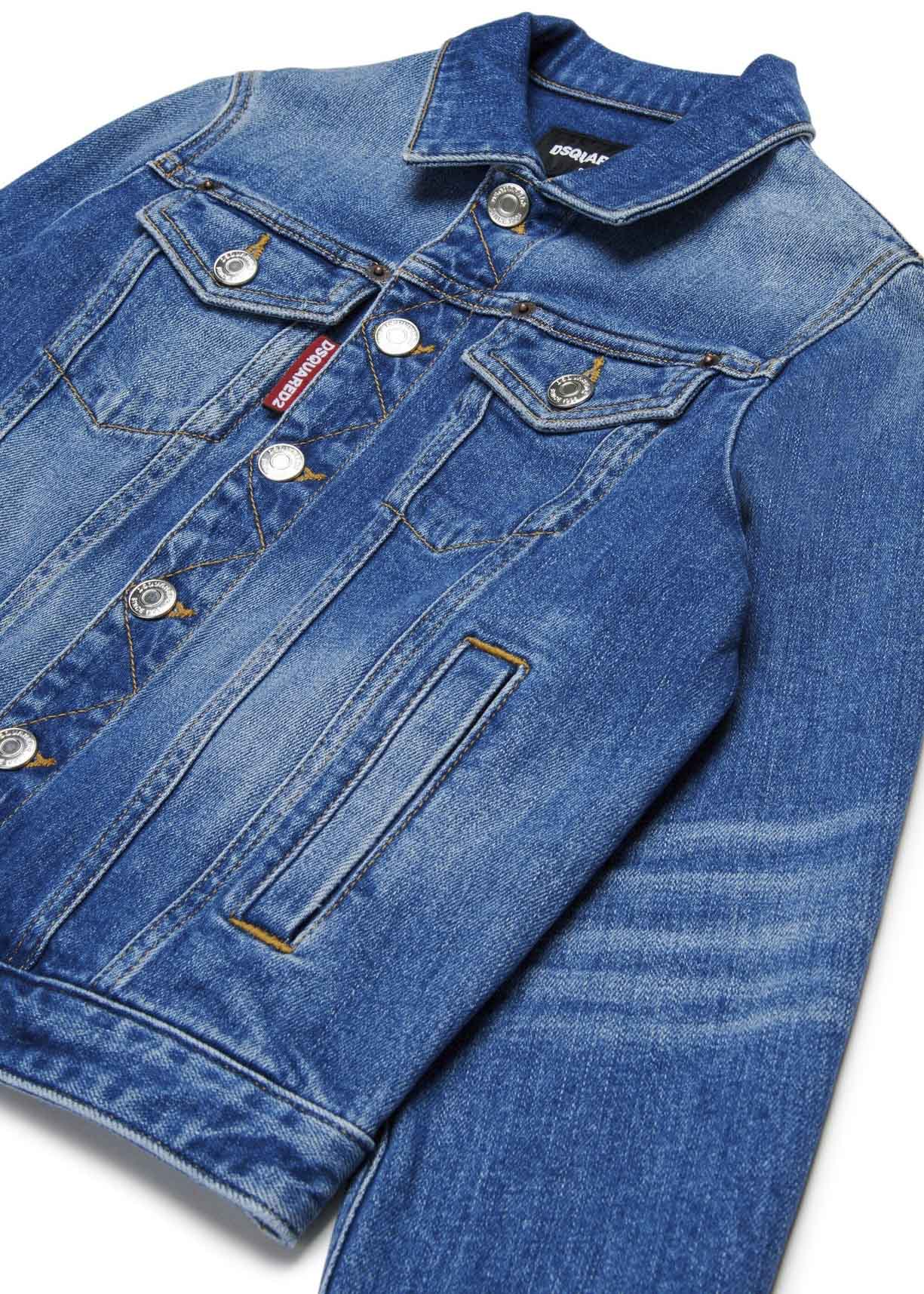 Dsquared2 Kids jacket in medium blue denim, perfect for adding a touch of style to the wardrobe of the little ones. This long-sleeved jacket is characterized by contrasting shades, whiskers and small abrasions, for a vintage and urban look. The Dsquared2 logo applied on the front and the pockets on the chest give a touch of character to this jacket. Equipped with a button closure and welt pockets, this jacket is ideal for a casual but fashionable outfit. Made of high-quality denim, it is a versatile garment that cannot be missing from any wardrobe of children.