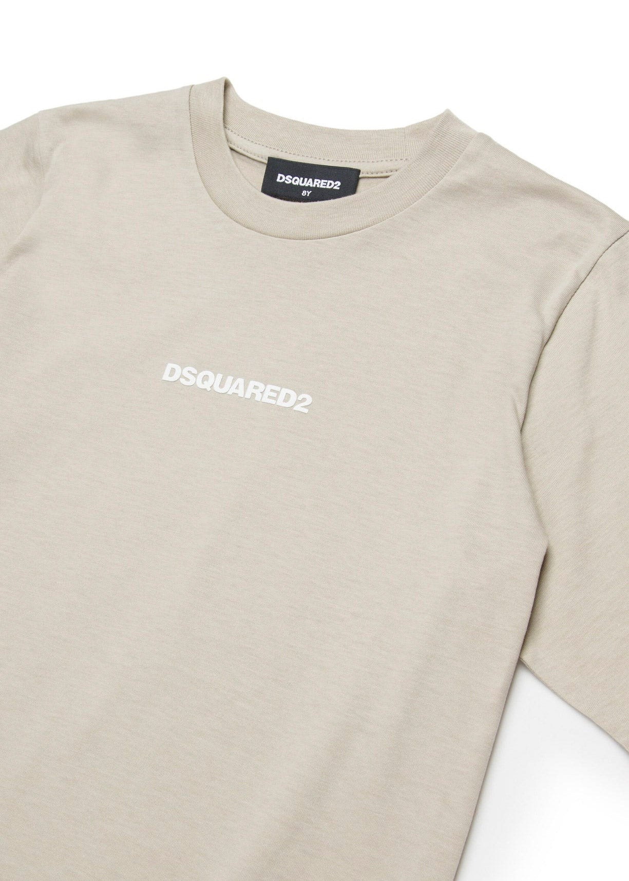 Beige DSquared2 Kids T-shirt in high-quality cotton, with crew neck and short sleeves. The simple and elegant design is embellished with a contrasting micro logo on the chest, which adds a distinctive touch to the garment. The straight hem and regular fit make it perfect for any informal occasion. Easy to match with any casual outfit, this T-shirt is ideal for a trendy and comfortable look for the little ones.