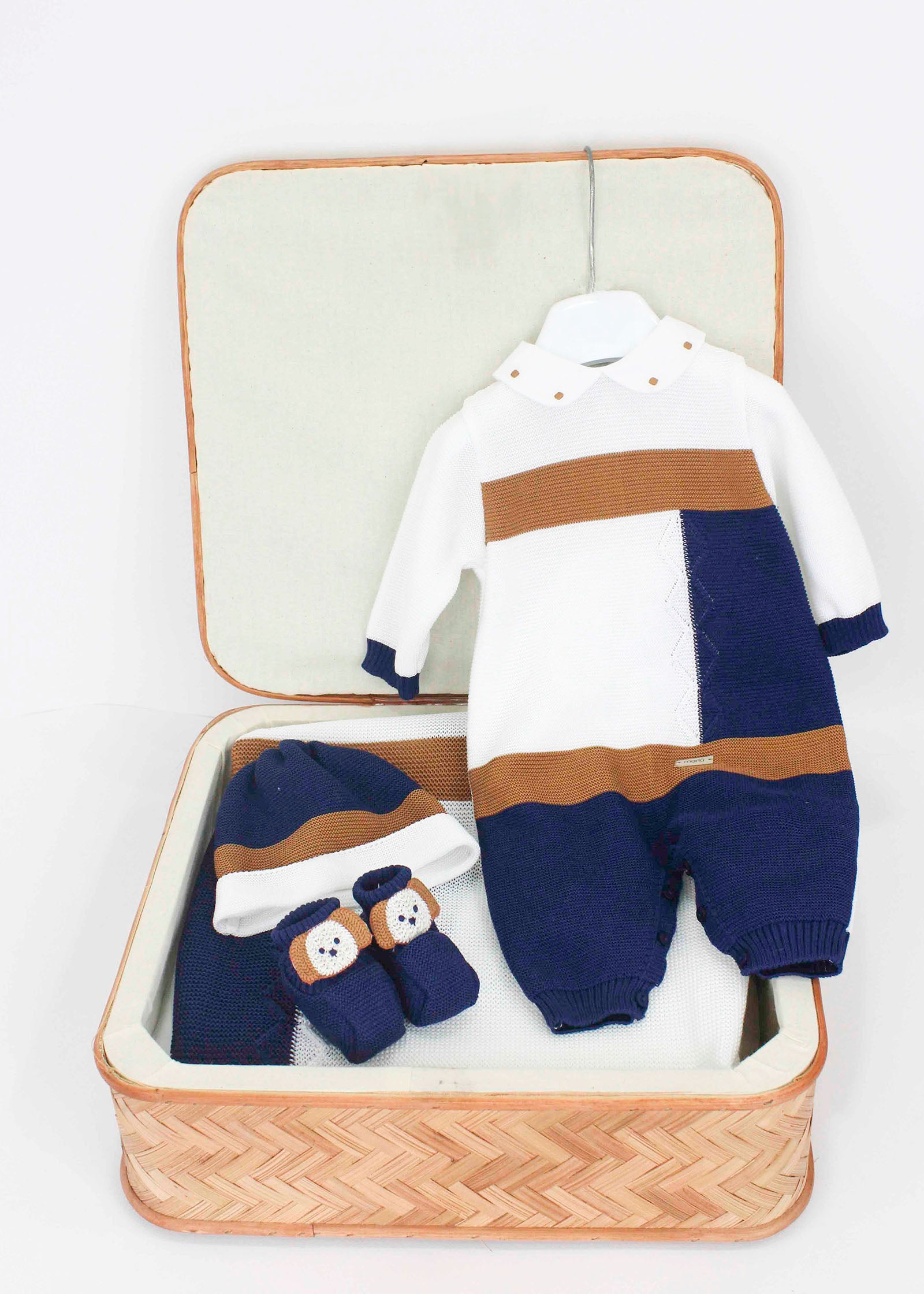 The Marlù White/Blue Baby Romper Set, available on Florence Kids, is an elegantly coordinated set, made with high-quality cotton, designed to meet the needs of newborns. This set includes a cute combination of a romper, with blue and brown details. The texture of the spun fabric adds a touch of elegance and comfort, making it perfect for the delicate skin of newborns. The set also includes coordinated accessories such as soft booties, a blanket and a hat, completing a stylish yet comfortable outfit for every newborn.