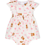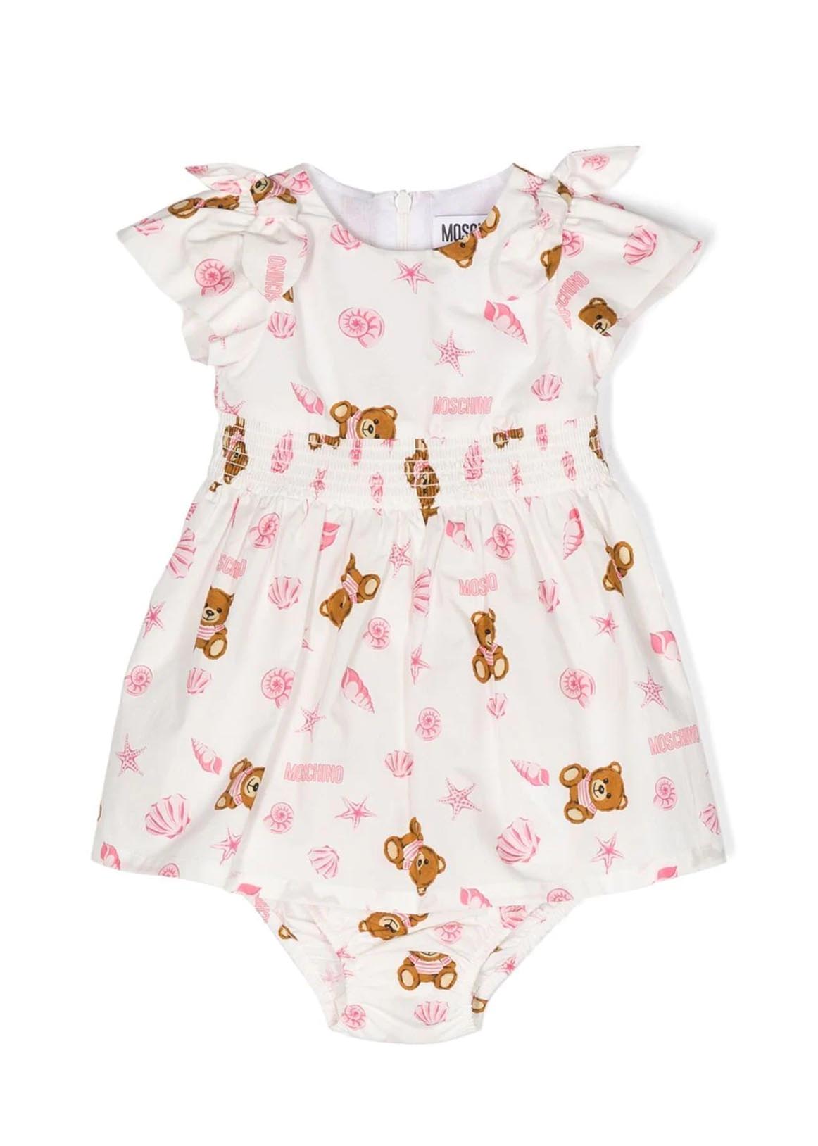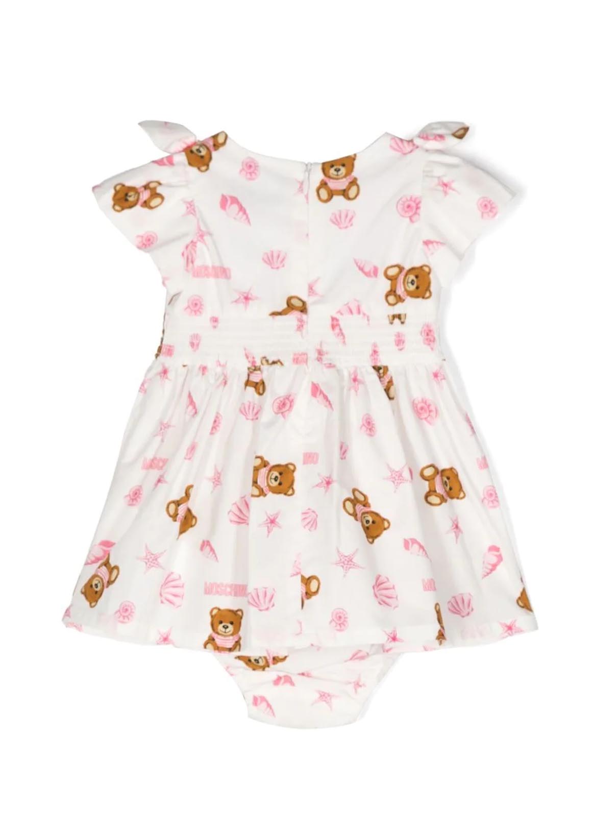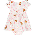 Teddy Bear Print Dress White/multicolor, cotton, signature Teddy Bear motif, all-over graphic print, round neck, short sleeves, back zip fastening, bow detail, ruffle panel and skater skirt.