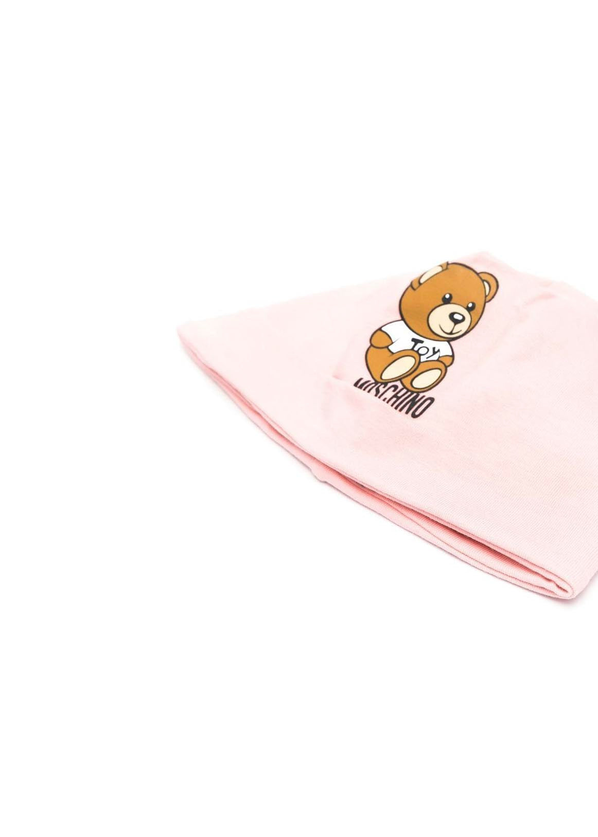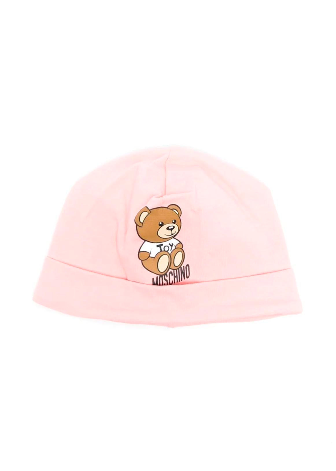 MOSCHINO KIDS Teddy Bear print hat in cotton blend, distinctive Leo Teddy print, fold-over peak, pull-on style and candy pink.