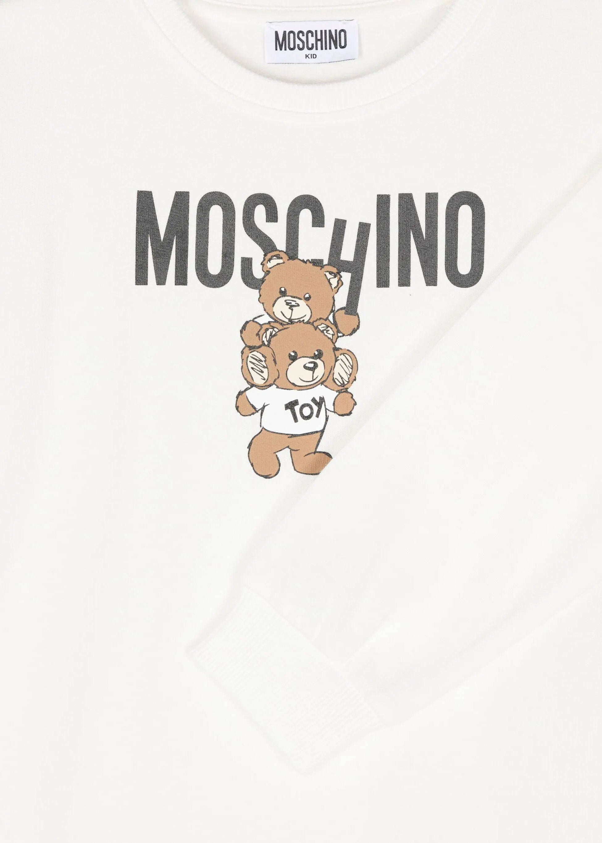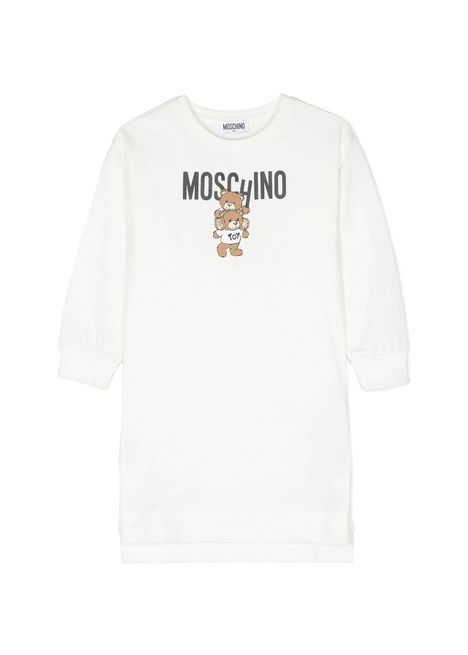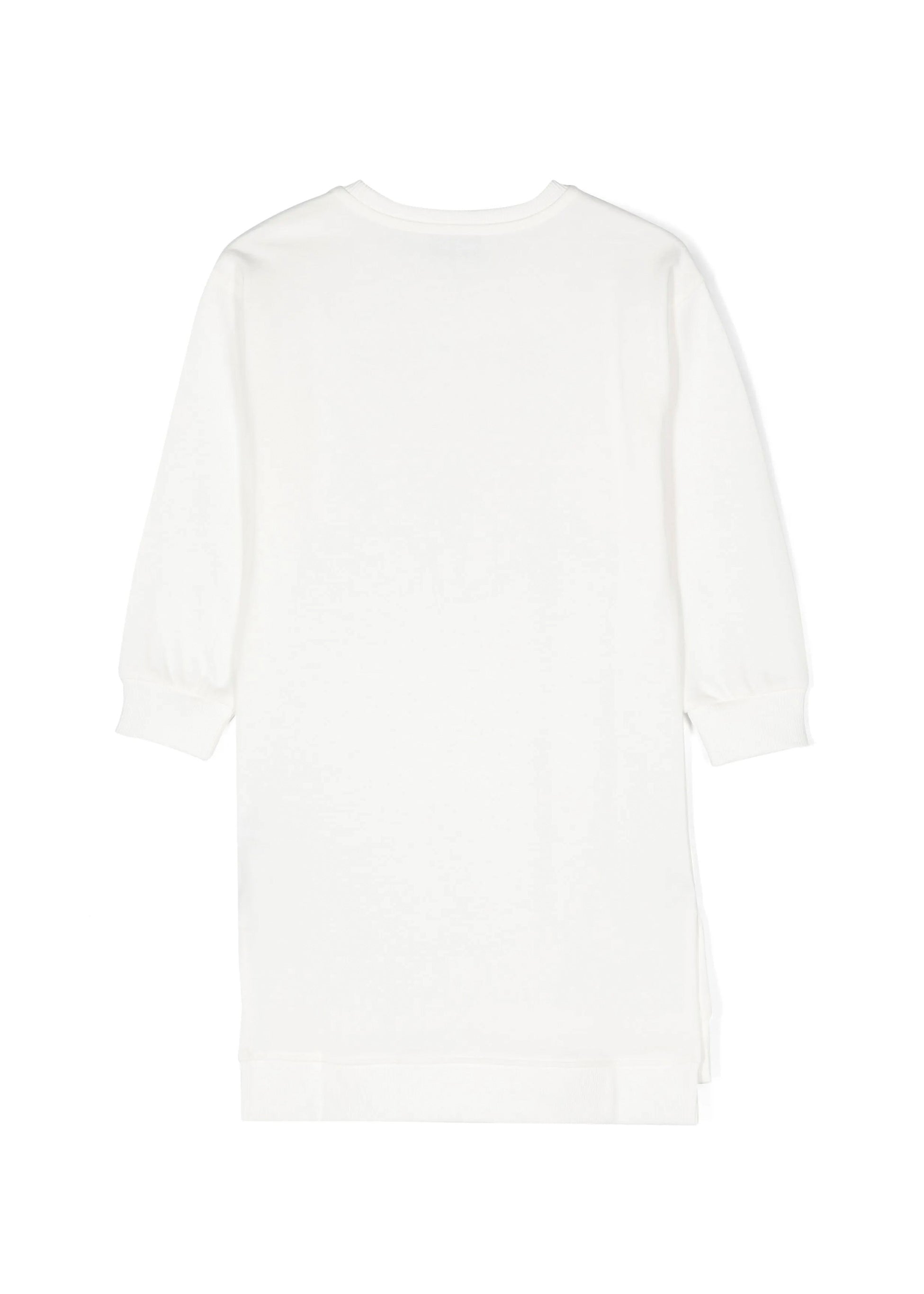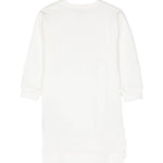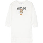 Introduce a touch of cuteness and style to your daughter's wardrobe with the Moschino Kids Logo Print Cream Dress, available on Florence Kids. Crafted from cotton with a jersey weave, this dress offers a comfortable and soft fit, perfect for play or special occasions. The design is embellished with the signature Teddy Bear motif and logo print on the front, which adds a playful and iconic touch. With long sleeves with dropped shoulders and ribbed hems, this dress combines comfort and fashion. The fleece lining adds an extra layer of warmth, making it ideal for cooler days. The side slits at the hem offer freedom of movement, making this dress as practical as it is cute.