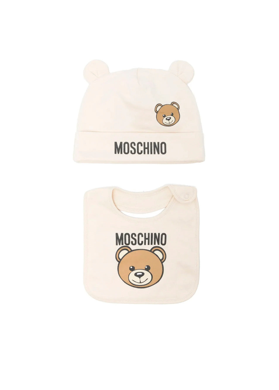 Complete your newborn's layette with the pink Hat and Bib Set with Teddy Bear Logo by Moschino Kids, an elegant and functional accessory for the first months of life. Made of soft cotton, it ensures comfort and delicacy on the baby's skin. The hat with round crown and cuffed hem gently envelops the head, keeping it warm, while the coordinated bib offers practicality during meals. Embellished with the iconic Moschino Teddy Bear print, this set is perfect as a birth gift idea or to complete a refined look with the matching onesie from the same collection.