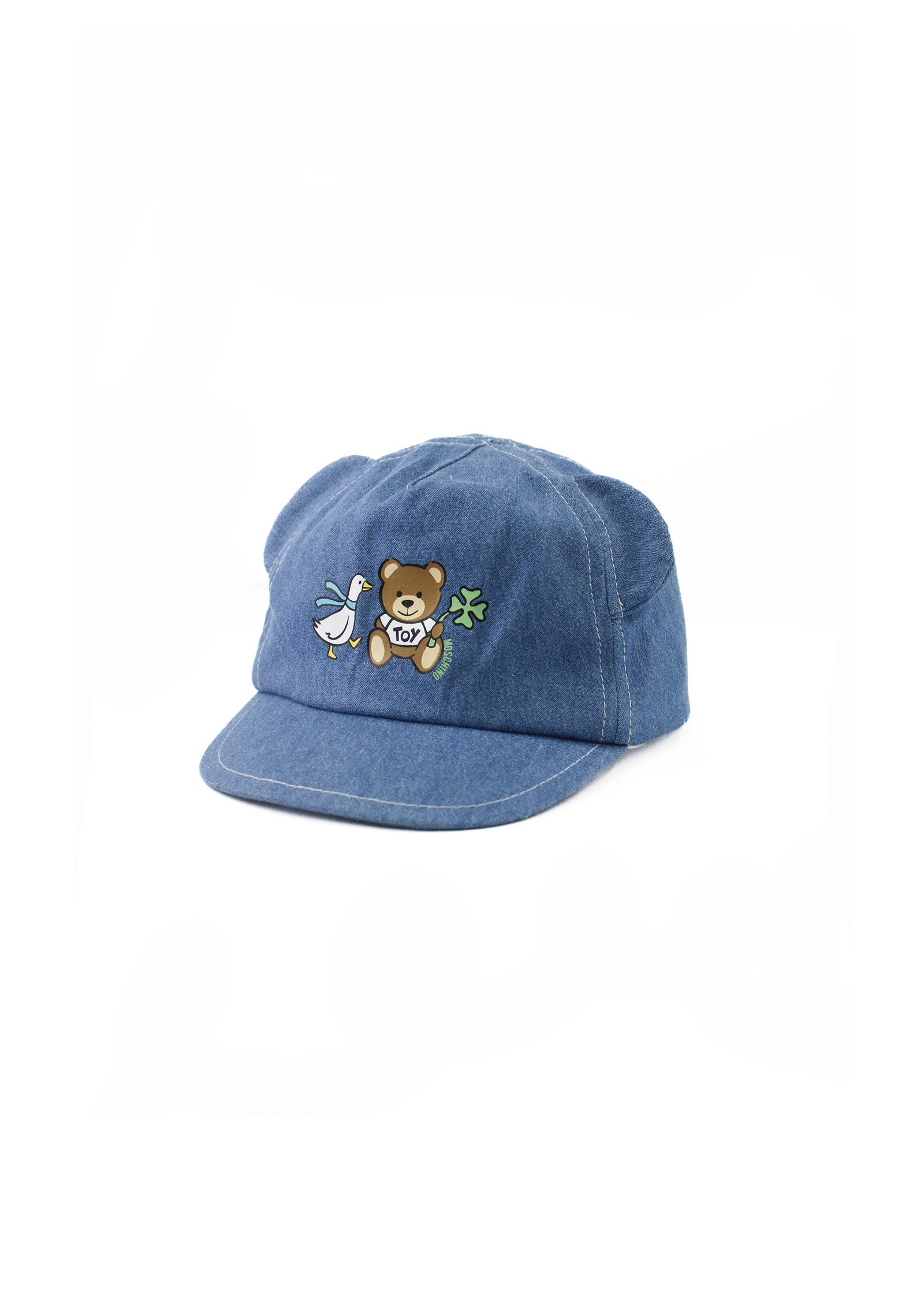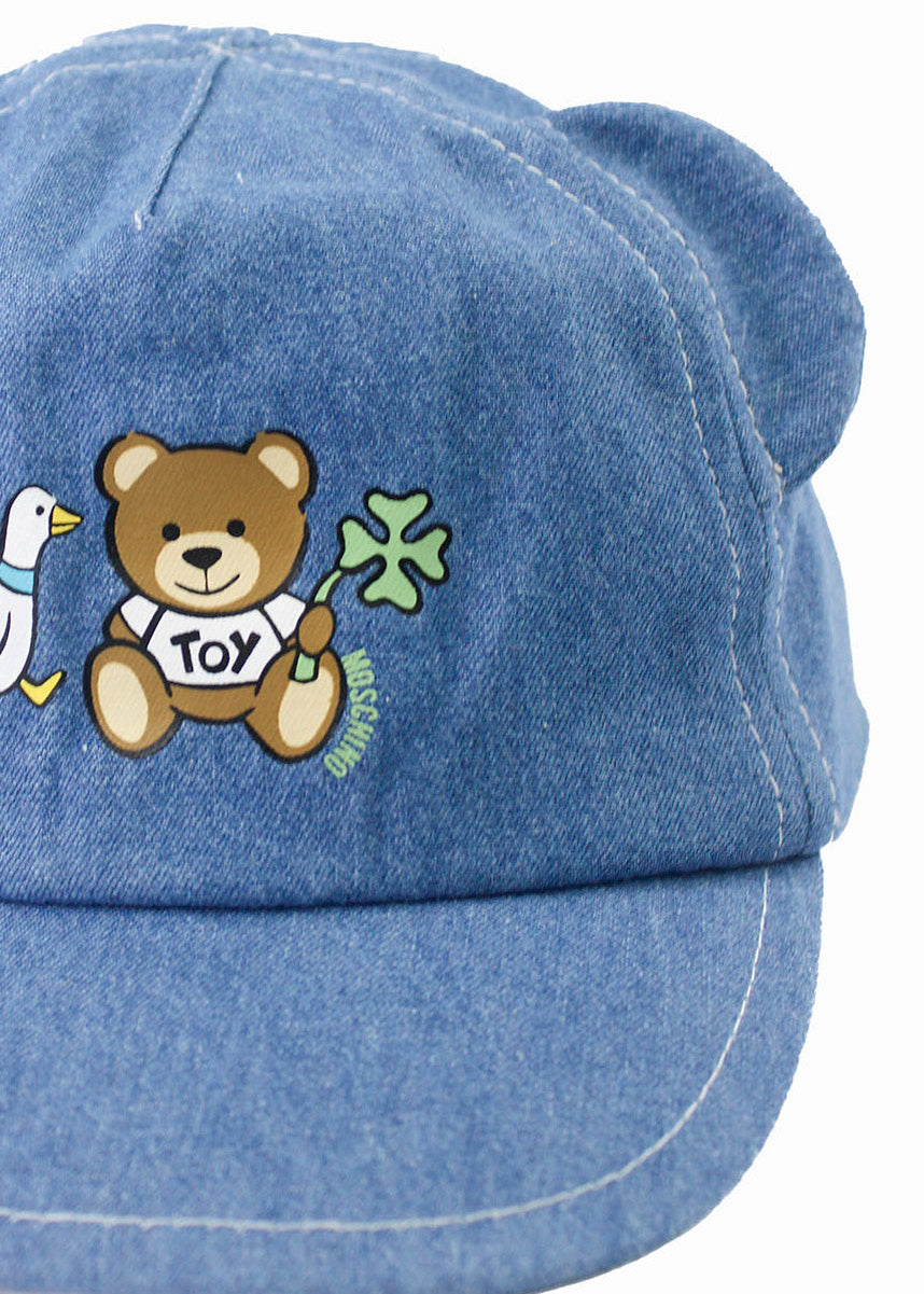 Complete your newborn's look with the Moschino Kids Teddy Ears Denim Hat, an irresistible accessory that combines comfort and style. Crafted from soft cotton, it offers a lightweight and breathable fit, perfect for protecting your little one's head on sunny days. The design features a curved brim and a fun Teddy Bear ear appliqué, adding a playful and original touch. The iconic Moschino Teddy Bear print on the front makes this hat a must-have for a cute and trendy look.