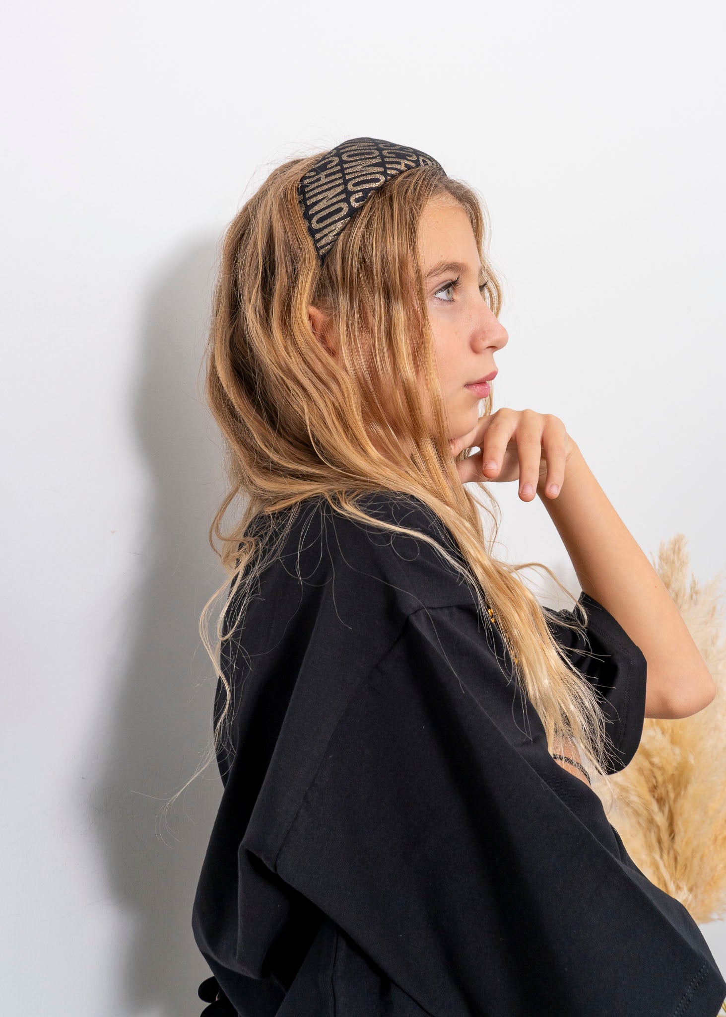 Elegant and sophisticated, the Black/Gold Monogram Logo Headband by Moschino Kids, available on Florence Kids, is the perfect accessory to complete any of your daughter's outfits. This headband features a padded design to ensure all-day comfort, avoiding discomfort or pressure on the head. The black color contrasts beautifully with the gold embossed Moschino logo, creating a luxurious and fashionable look. The slip-on design with curved tip temples ensures a secure fit and easy to wear. Ideal for special occasions or to add a touch of glamour to an everyday outfit, this headband transforms any moment into a special occasion.