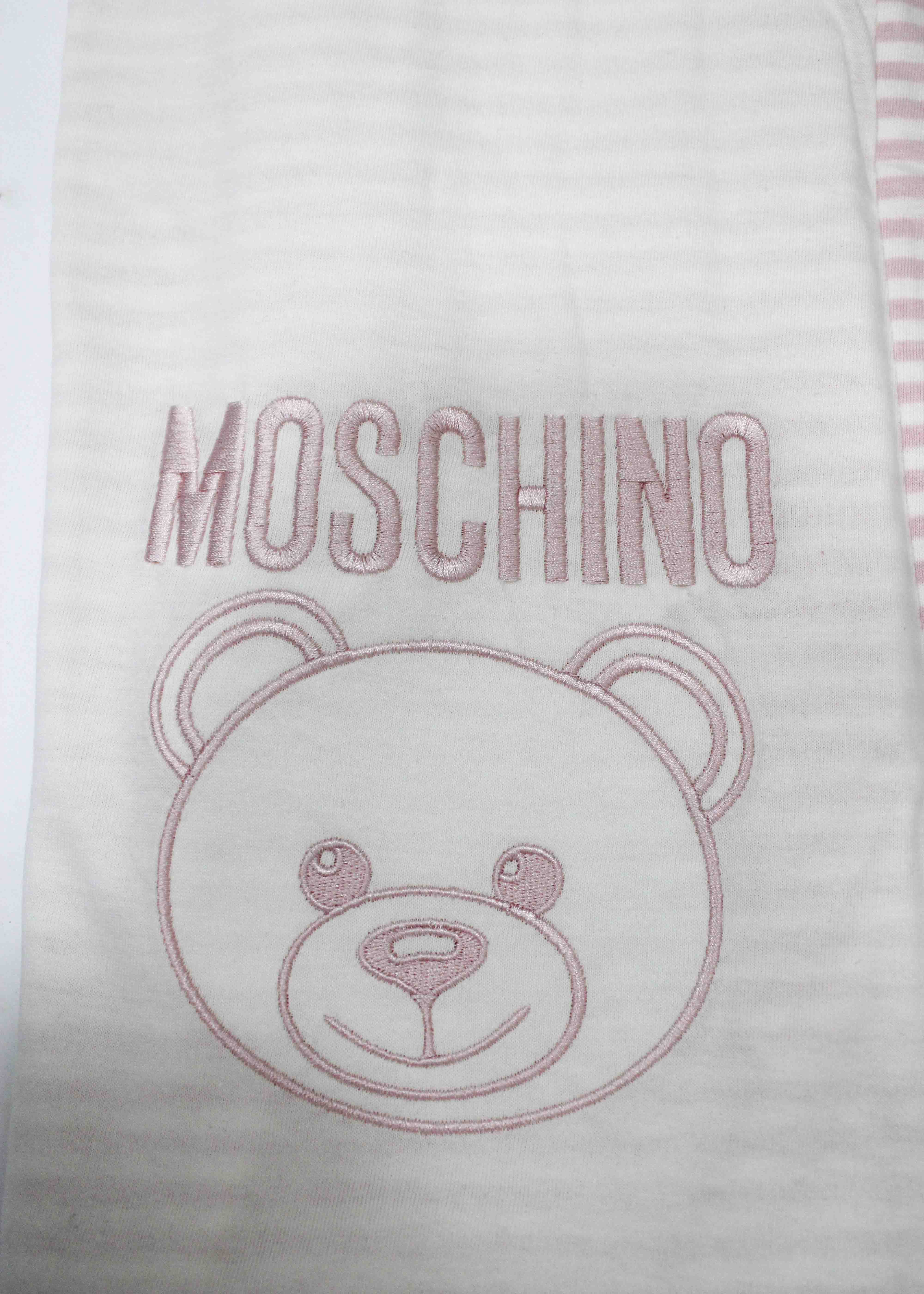 Wrap your newborn in softness and style with the Moschino Kids Pink Striped Blanket with Logo, available on Florence Kids. This elegant blanket is crafted from high-quality cotton, ensuring comfort and gentleness on the sensitive skin of little ones. The pink striped design is enriched with a refined embroidery of the Moschino logo and the iconic teddy bear, adding a touch of charm and distinctiveness. The straight hem keeps the design clean and simple, perfect for cradling your baby in absolute comfort. Included in the package, you will also find a matching onesie, making this set an ideal gift for new parents.