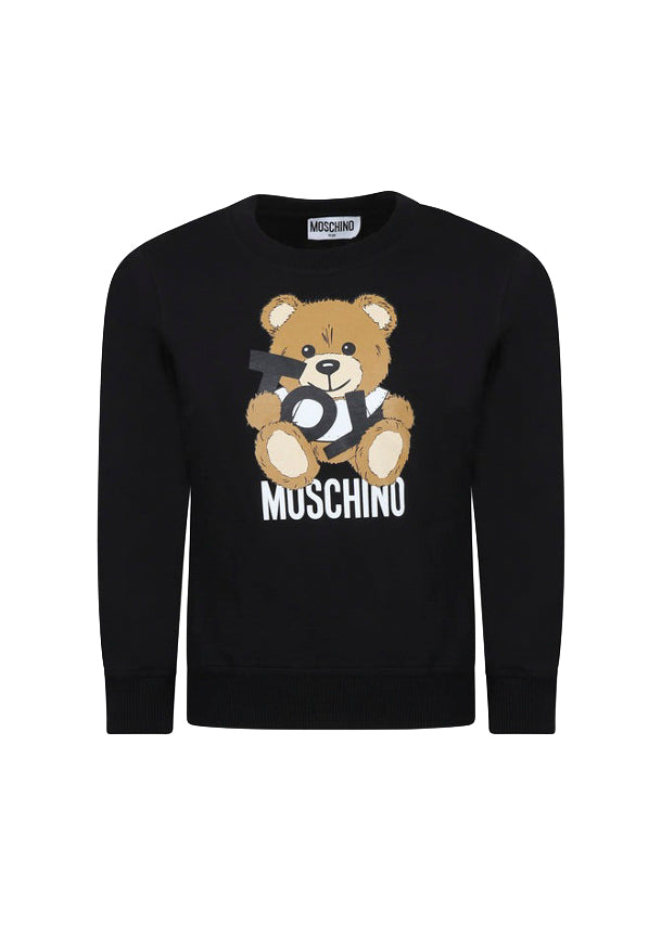 Add a touch of sweetness and style to your little girl's wardrobe with the Black Sweatshirt with Toy Print by Moschino Kids. Crafted from soft cotton, this sweatshirt offers maximum comfort and warmth, ideal for cooler days. The classic round neck, long sleeves and straight hem ensure a comfortable and versatile fit. The print with the iconic Moschino Teddy Bear on the front adds a playful and distinctive detail, perfect for a casual and trendy look. Perfect to pair with jeans, leggings or joggers for a practical and refined style.