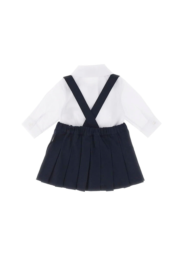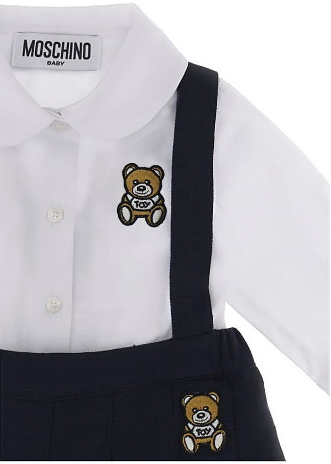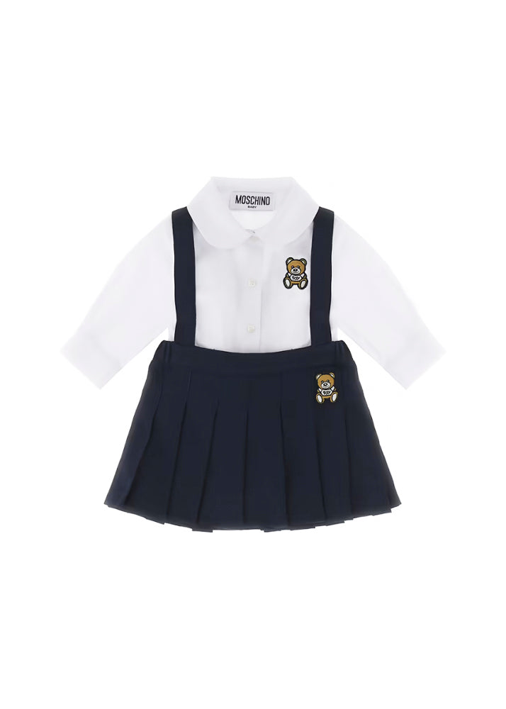 The Moschino Kids baby set is an elegant set that combines a white shirt with long sleeves and a blue pleated skirt, perfect for special occasions. The shirt features a Peter Pan collar and a front button fastening, while the practical snap button fastening between the legs makes changing easy. The skirt, with an elasticated waist and adjustable shoulder straps, is decorated with an adorable Teddy Bear patch on the front and a logo applique on the side. A sophisticated and comfortable set that best expresses the Moschino style.