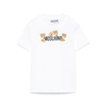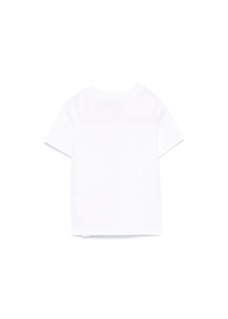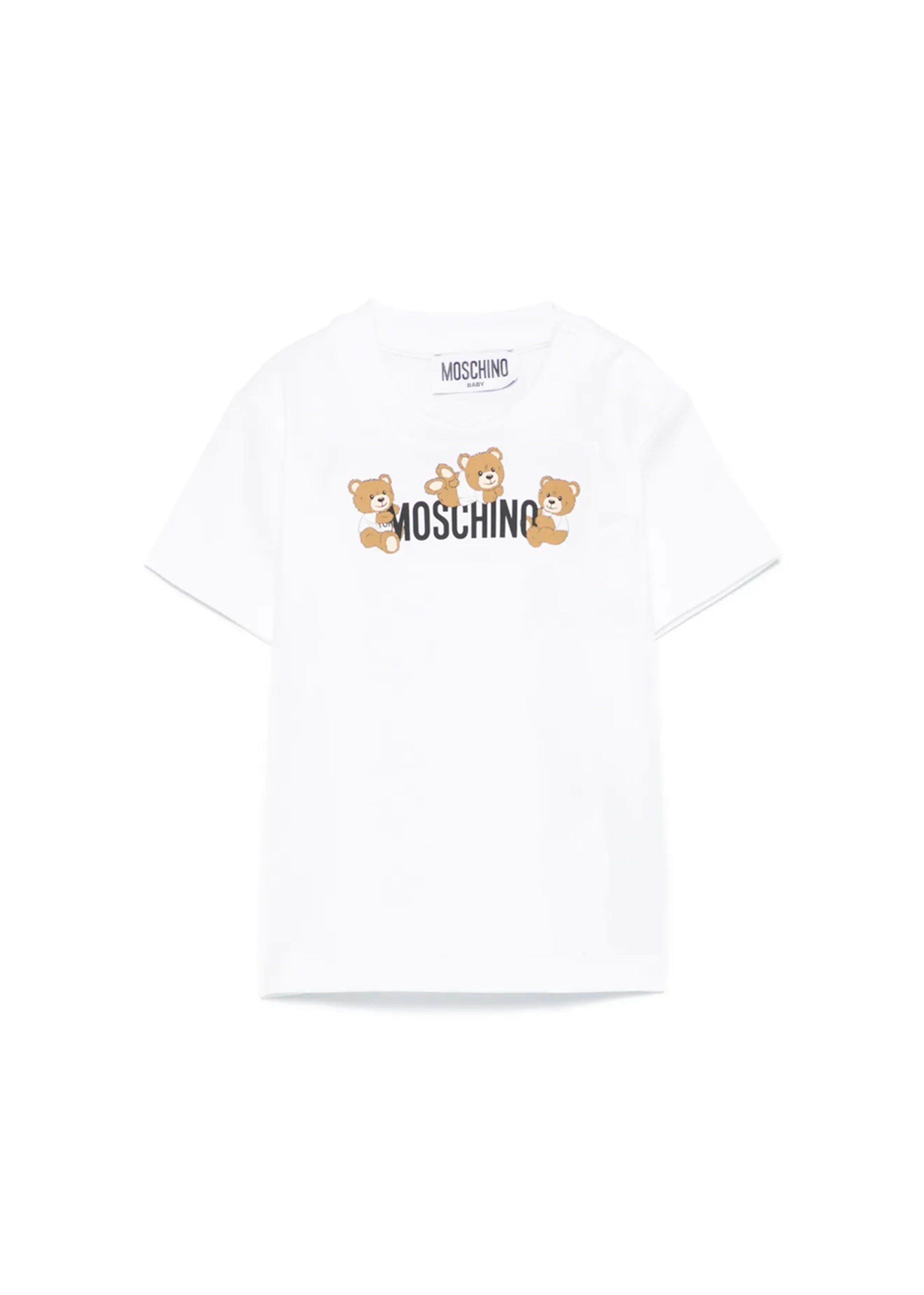 Add a touch of sweetness to your baby's wardrobe with the White Teddy Print T-shirt by Moschino Kids. Crafted from soft cotton, it guarantees maximum comfort and delicacy on the skin. The design features a classic crew neck, short sleeves and a straight hem, ensuring a comfortable and versatile fit. The snap button fastening on the shoulder makes it easy to get dressed, while the print with the iconic Moschino Teddy Bear adds a distinctive and playful detail. Perfect to pair with trousers or shorts for a sweet and fashionable look.