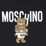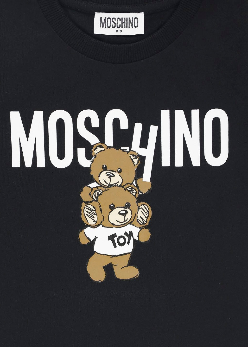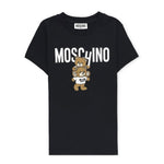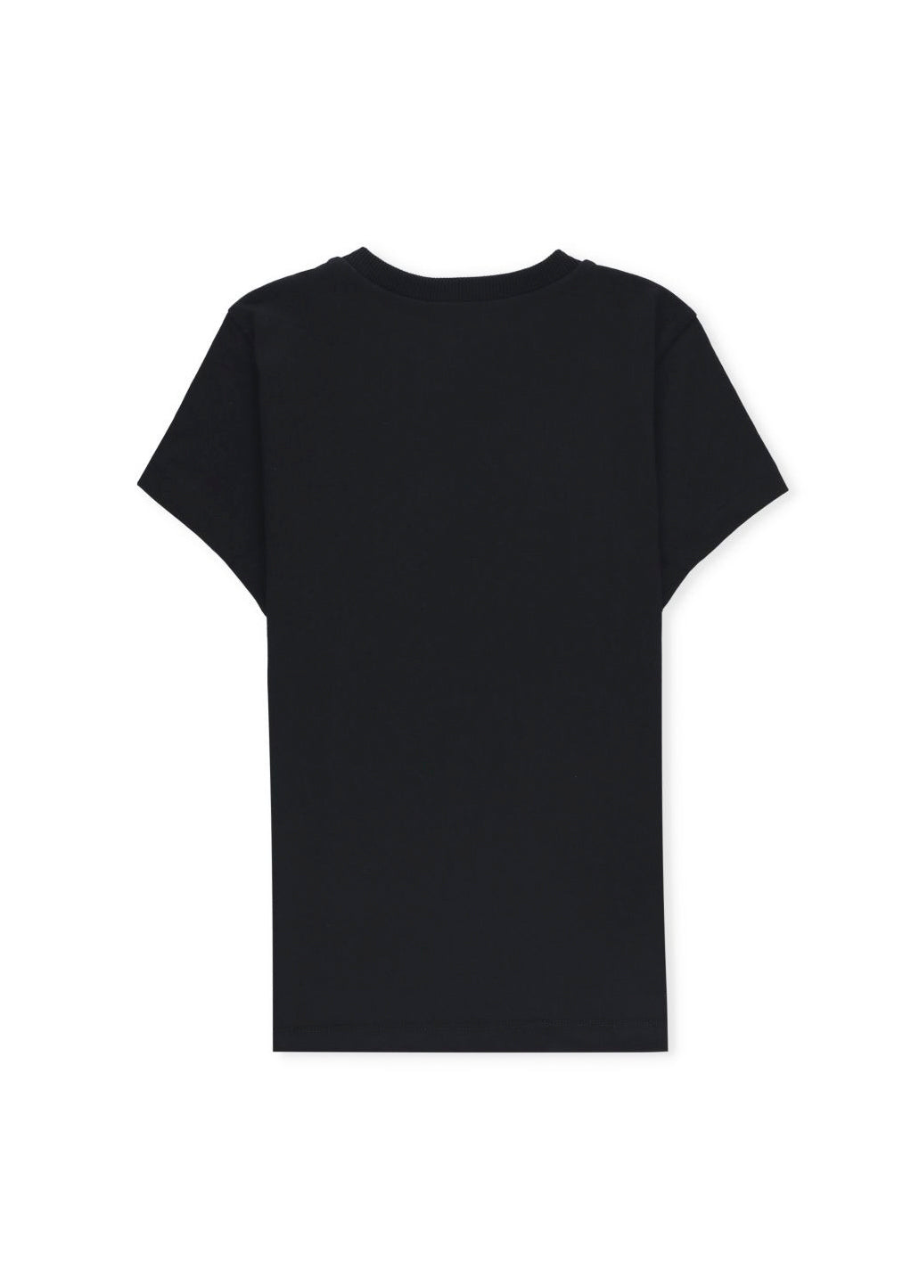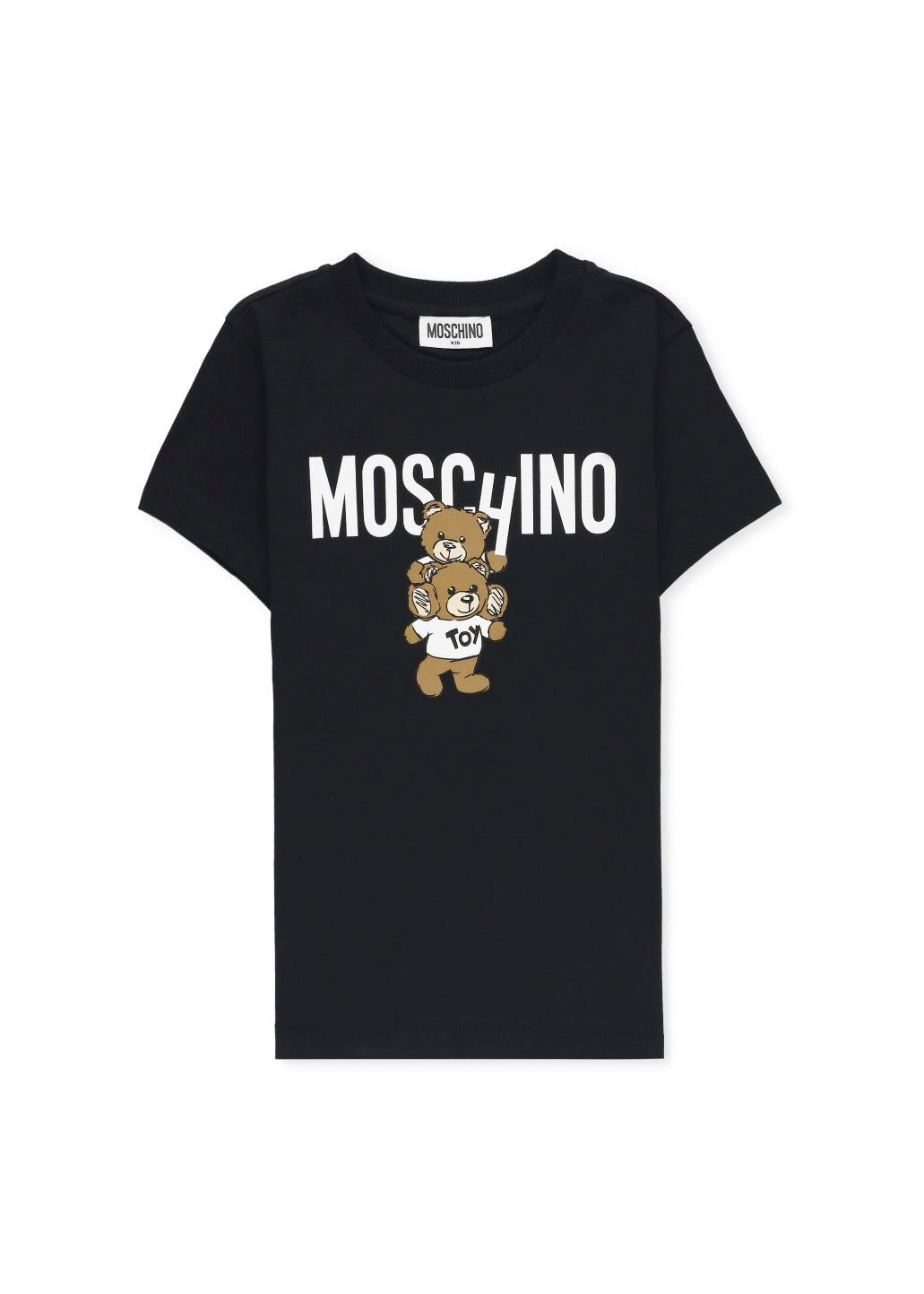 The black Moschino Kids t-shirt for children is made of soft cotton jersey, offering maximum comfort. The print of the brand's iconic teddy bear and the logo in black on the front create a distinctive and fashionable look. With ribbed finishes and a straight hem, this t-shirt is a versatile piece that adapts perfectly to various casual outfits. Ideal for any occasion, it is a must-have for little Moschino fans who want a comfortable and stylish look.