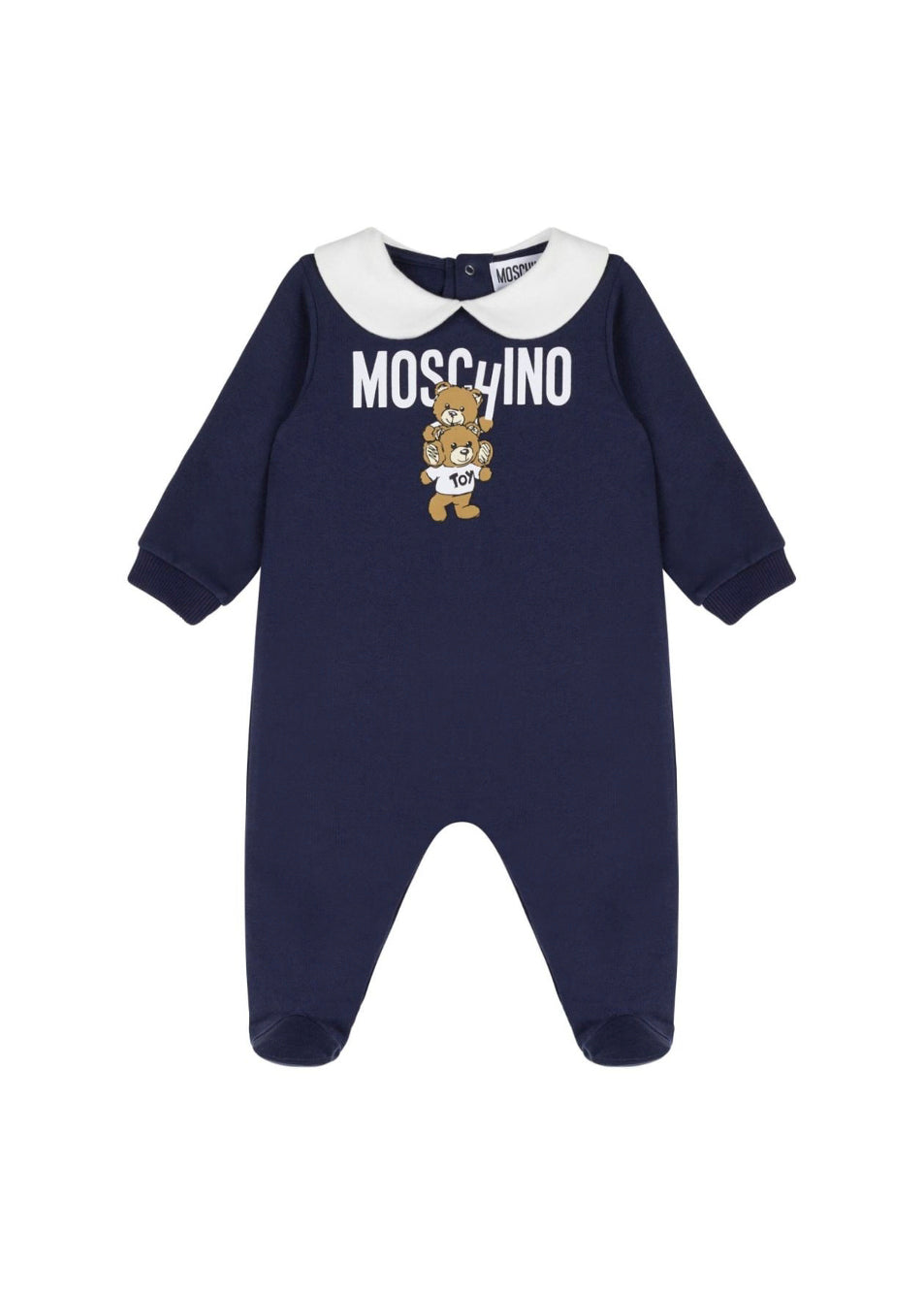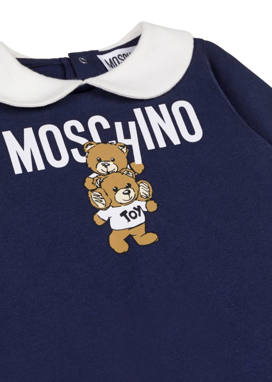 Moschino Kids Tutina Blu con Stampa Logo Teddy Bear per Neonati (dettaglio)