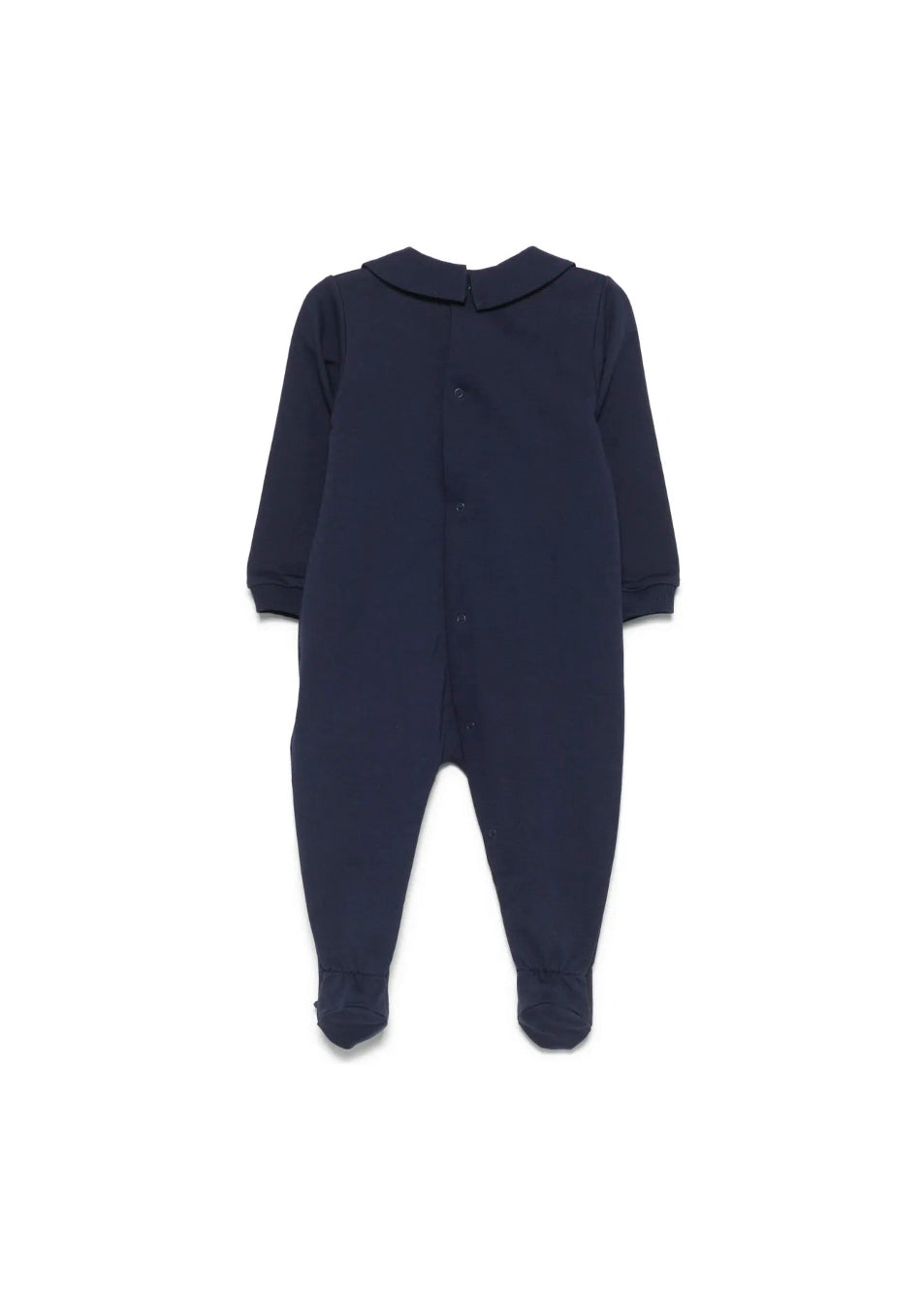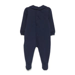 Give your newborn a refined and comfortable look with the navy blue Teddy Bear Logo Romper from Moschino Kids. Made from soft cotton, this romper is perfect for wrapping your little one in a hug of comfort. The Peter Pan collar adds a touch of elegance, while the sock design keeps little feet warm. The snap button fastening at the back makes changing quick and easy, and the ribbed cuffs ensure a perfect fit. Embellished with the classic Moschino logo with the Teddy Bear, it is ideal for the first few months of life and perfect as a birth gift.