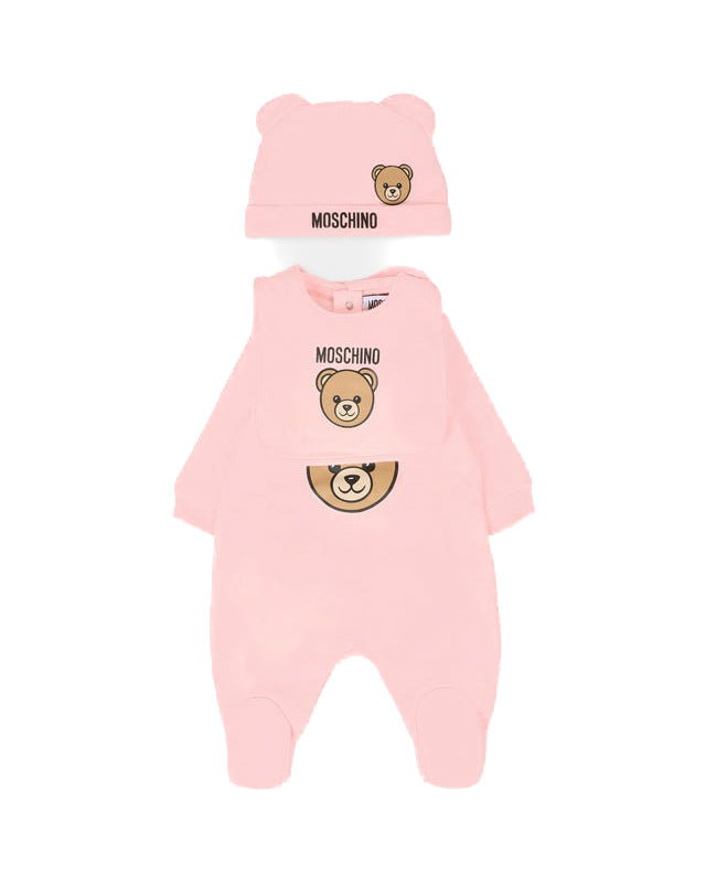 L’insieme è perfetto come idea regalo elegante e pratico per la nascita o prime occasioni, unendo design iconico, dolcezza e coordinazione firmata Moschino.