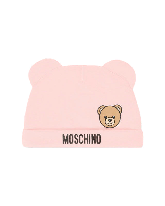 Cappellino rosa coordinato decorato con un logo Moschino o stampa Teddy, morbido ed elastico
