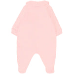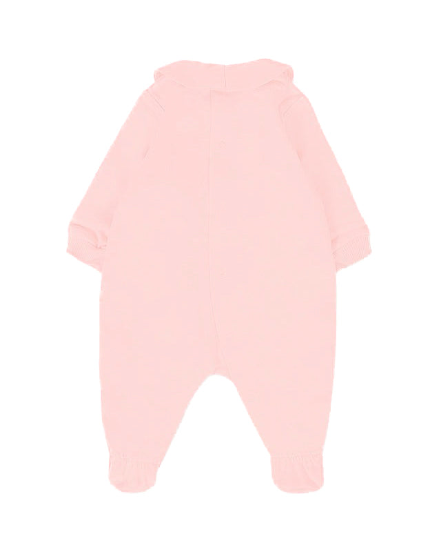Tutina rosa con maniche lunghe e piedini integrati, chiusura con bottoni automatici sul retro o tra le gambe per cambi rapidi