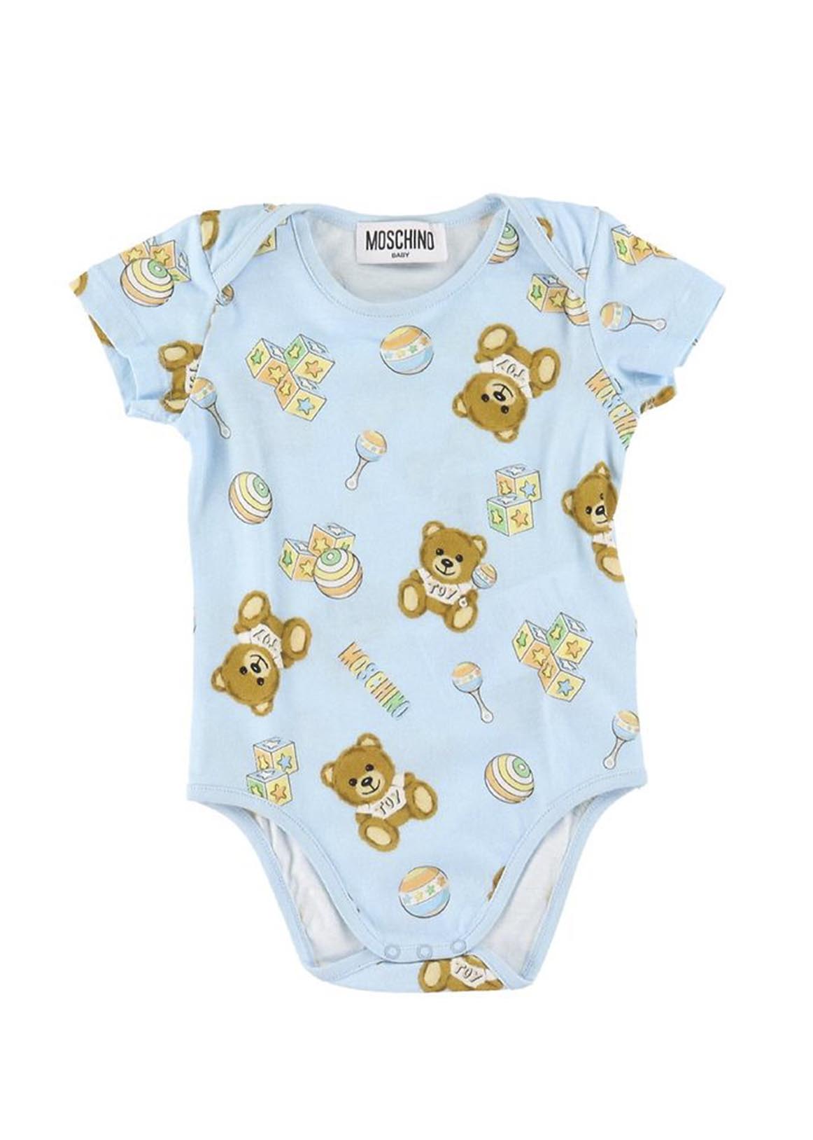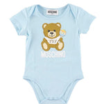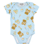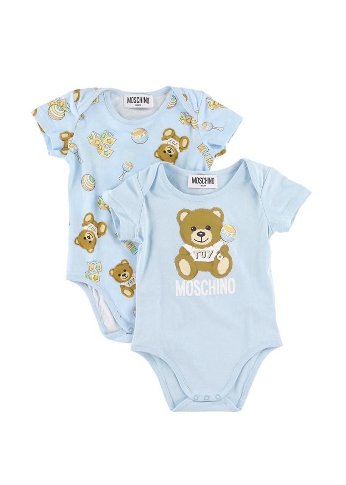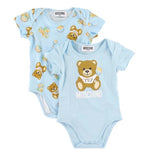 Moschino body composition 100% cotton. Set of 2 pieces: one in plain blue with teddy logo on the front, the other with teddy and bells print. Half sleeve crew neck, button fastening inside the thigh. Regular fit complete with box.