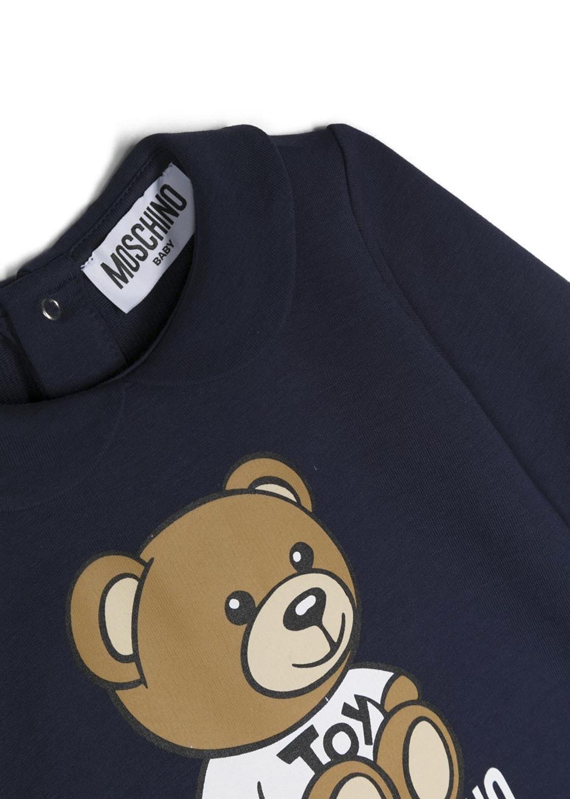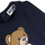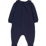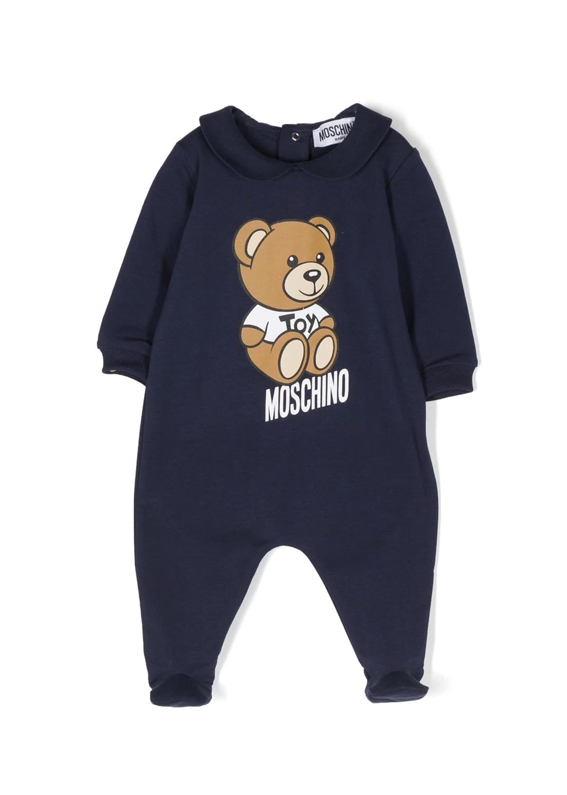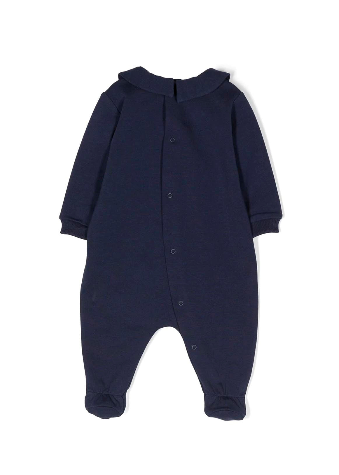 Teddy Bear Print Onesie Blue, large Peter Pan collar, button fastening at the back, long sleeves, fitted cuffs and sock design.