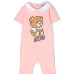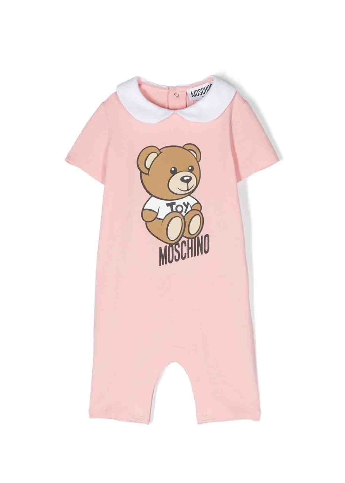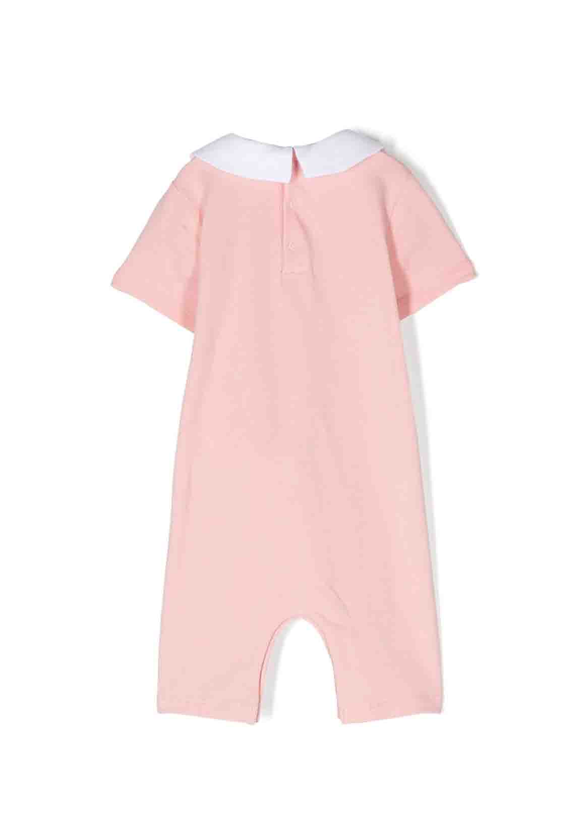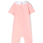 Teddy Bear Print Romper Salmon pink, signature Teddy Bear motif, logo print on the front, Peter Pan collar, short sleeves and adjustable snap button fastening at the back.