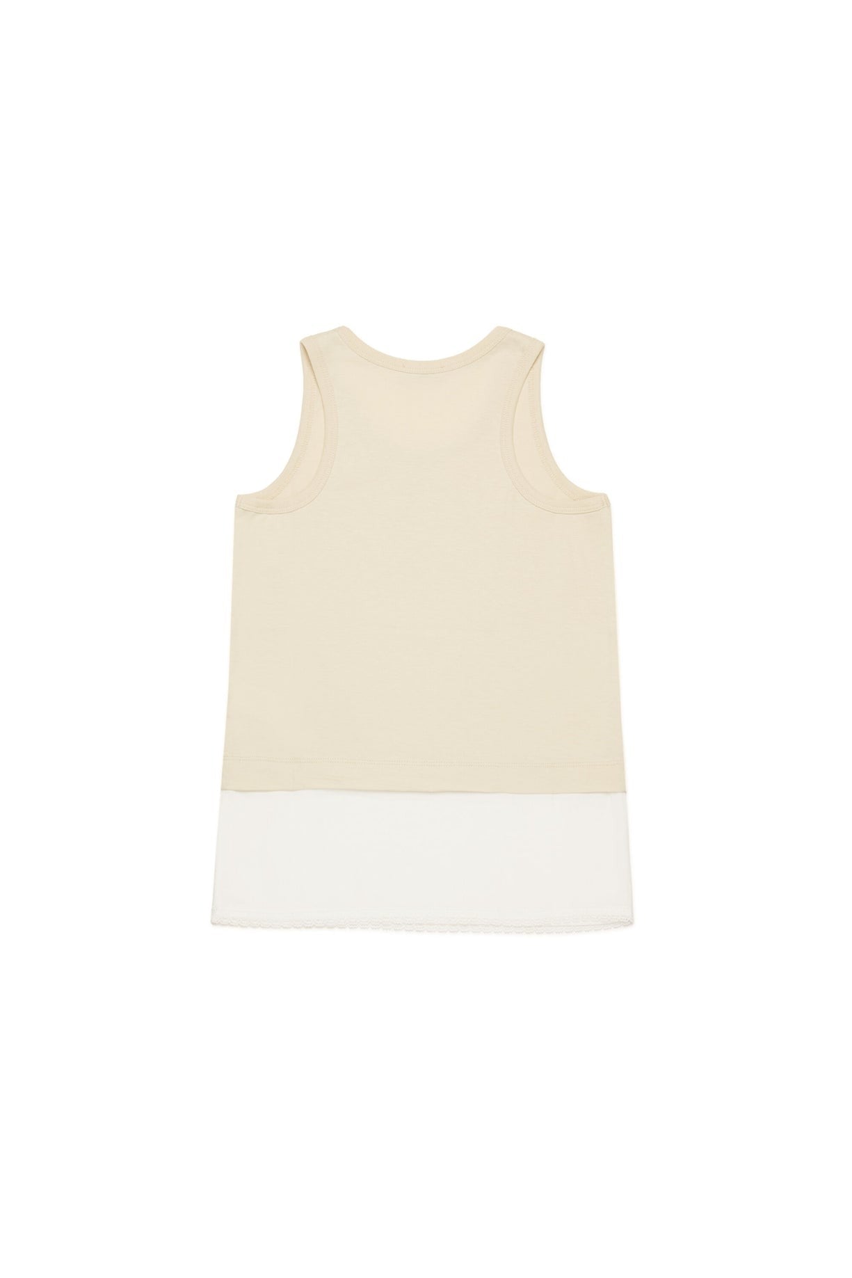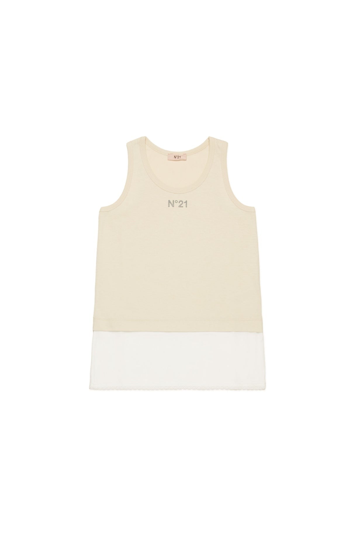 With a refined design and romantic taste, the champagne tank top for girls by N°21 Kids is perfect for those looking for an elegant yet contemporary look. Made of soft and lightweight jersey, it features a double-layer construction with a crepe bottom and delicate lace, which gives movement and a sophisticated touch. The rubberized N°21 logo on the chest adds a modern and distinctive detail. Ideal for special occasions, ceremonies or to give a chic twist to an everyday outfit, this tank top can be easily paired with elegantly cut skirts or trousers.