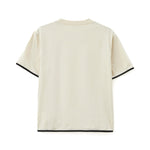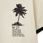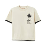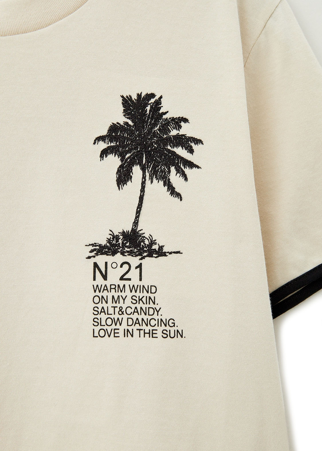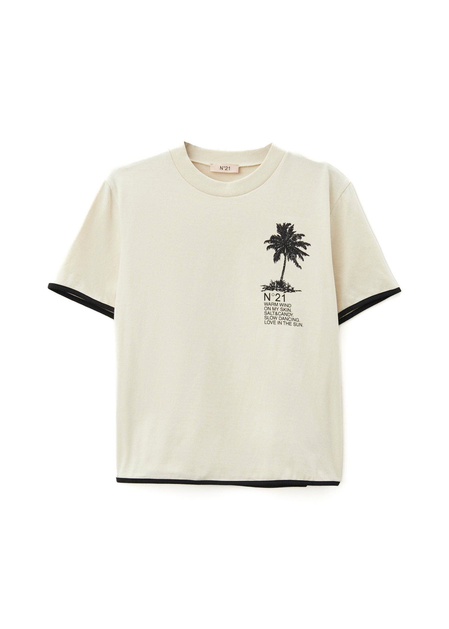 The N°21 Kids champagne T-shirt with Palms print is a unisex garment with a fresh and contemporary style, designed for boys and girls. Made of soft cotton, it features a Palms print on the front that recalls summer and holiday atmospheres. The contrasting black details on the neck and sleeves add a distinctive graphic touch, while the comfortable fit makes it perfect for accompanying the little ones on days out or during their free time. Versatile and trendy, it is ideal to pair with shorts, jeans or Bermuda shorts for a relaxed and urban look.