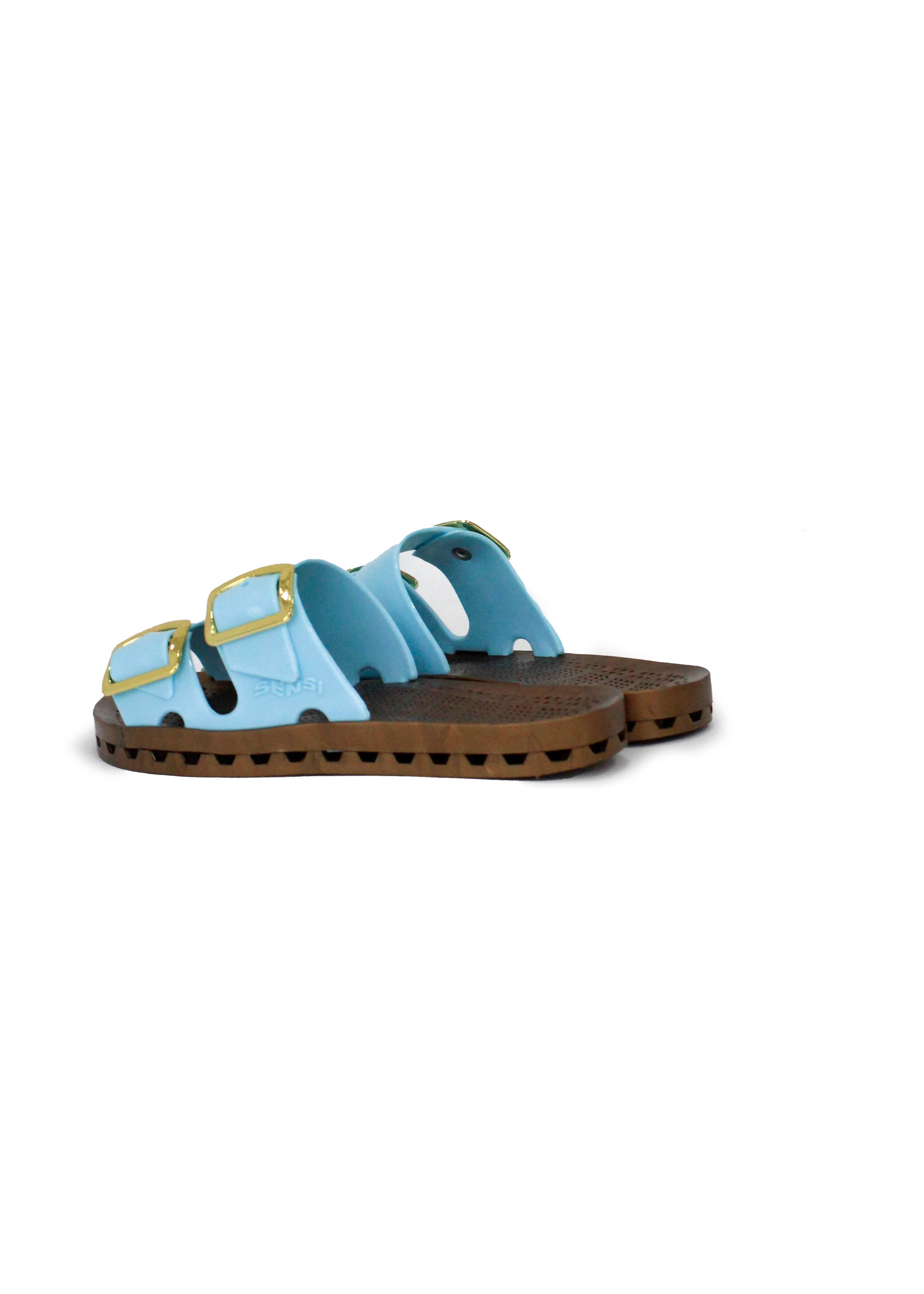The Prestige Celeste Double Band Children's Sandal by Sensi Kids, available on Florence Kids, combines elegance and practicality. Made of soft light blue rubber, it features adjustable buckles that guarantee a perfect fit. The simple and elegant design, enriched by a soft rubber finish, makes it versatile for any occasion, from casual to more sophisticated clothing. The non-slip sole and perforated tread make the sandal the ideal choice for the summer while the pull-on design makes it easy and practical to wear. It is ideal for wearing with a light dress or a more structured ensemble such as capri pants and a patterned blouse.