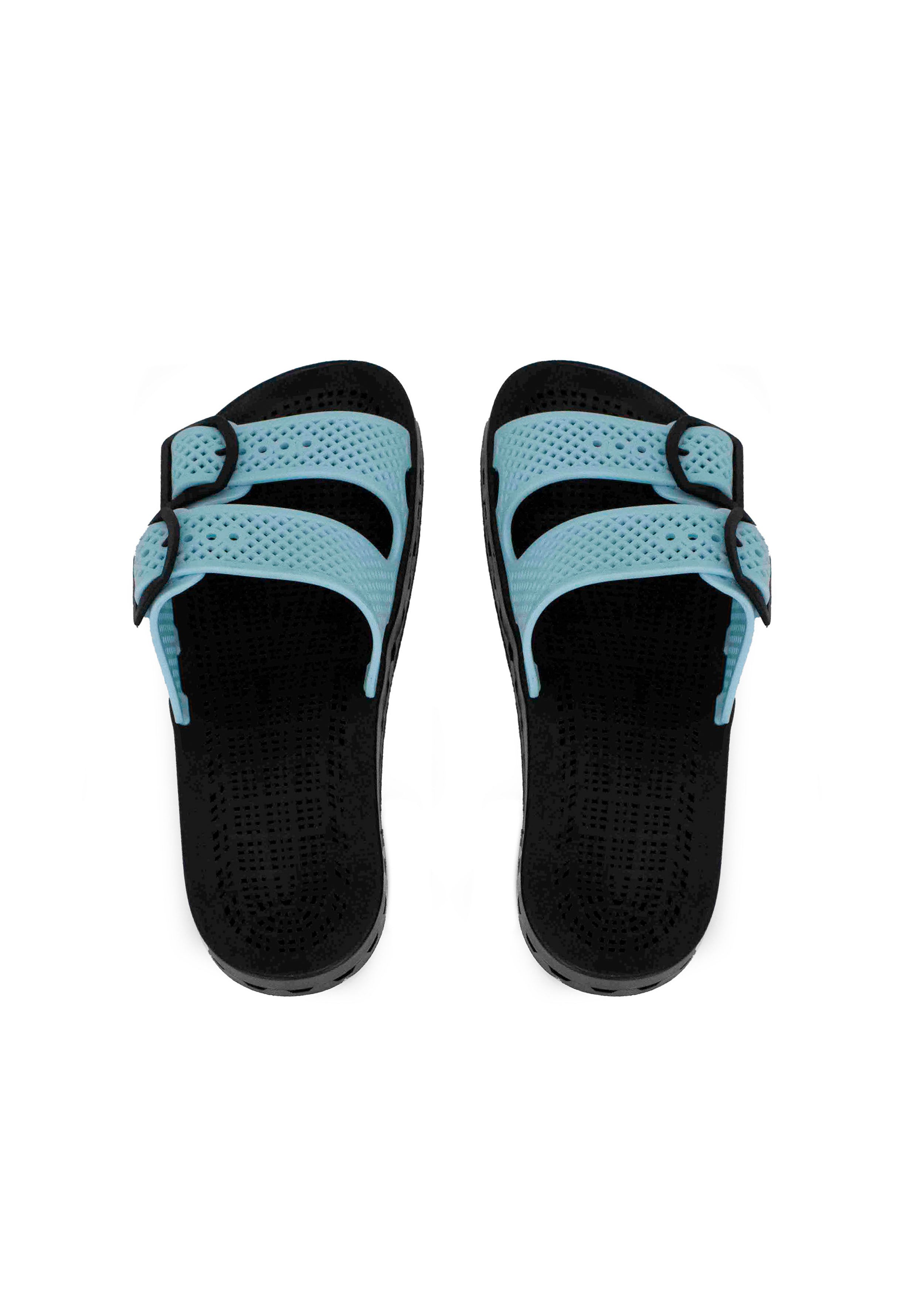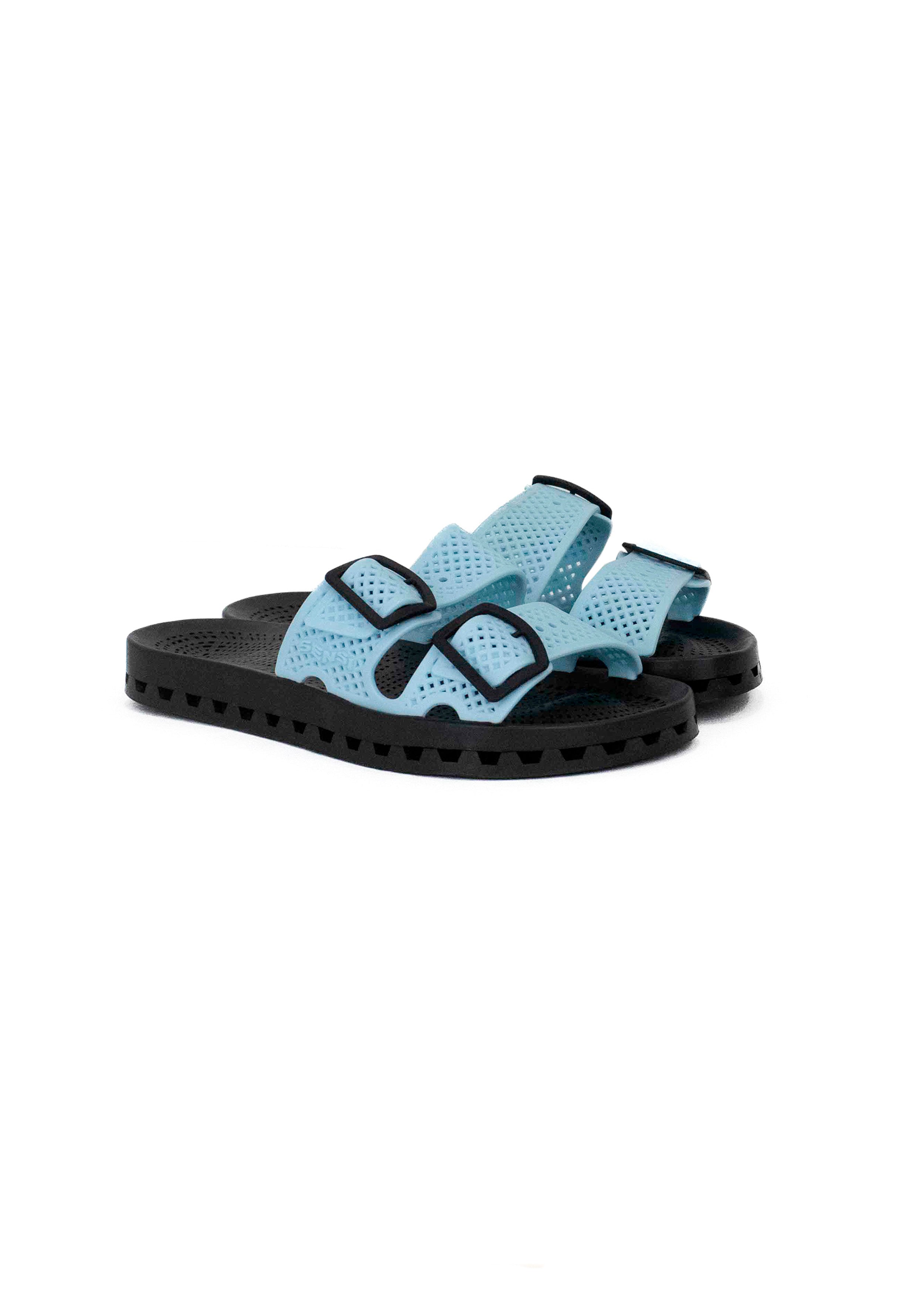 The Urban Celeste Double Band Sandal for Children by Sensi Kids, available on Florence Kids, combines elegance and practicality. Made of soft light blue rubber, it features adjustable buckles that guarantee a perfect fit. The simple and elegant design, enriched by a soft rubber finish, makes it versatile for any occasion, from casual to more sophisticated clothing. The non-slip sole and perforated tread make the sandal the ideal choice for the summer while the pull-on design makes it easy and practical to wear. It is ideal for wearing with a light dress or a more structured ensemble such as capri pants and a patterned blouse.