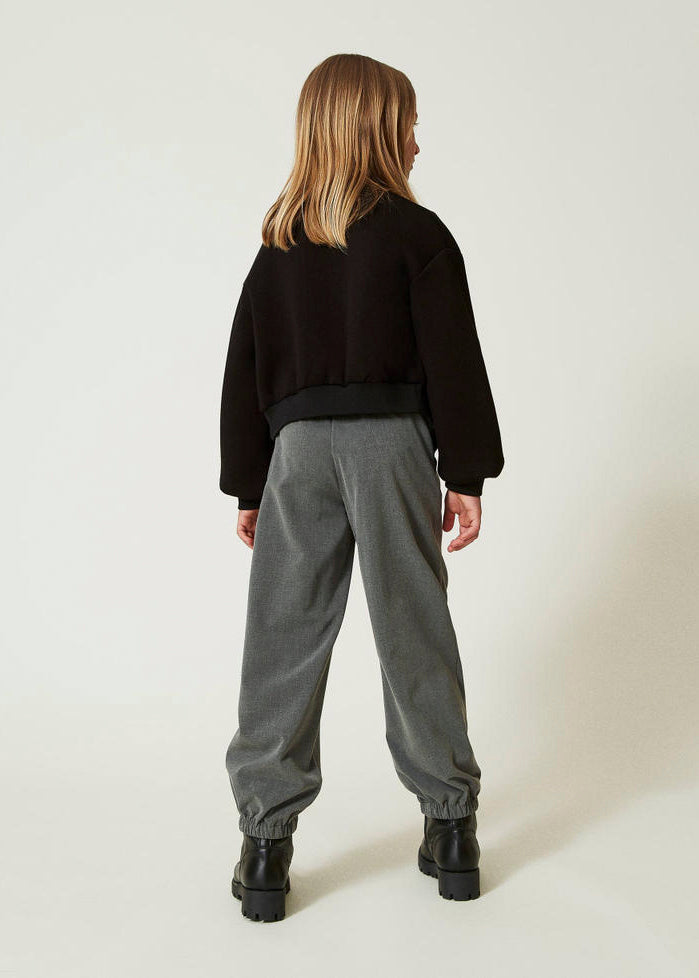 Discover the Twinset Kids joggers, a must-have for little girls' wardrobes! Made from high-quality technical flannel, these joggers offer a comfortable and fashionable fit. Featuring a removable grosgrain belt with a shiny printed logo, they allow you to customize the look as you wish. The elastic waist and bottom ensure a perfect fit, while the regular waist with belt loops offers the possibility of combining a belt. The pockets on the sides are practical and functional, making these trousers ideal for both play and informal occasions. With a soft line and an elegant design, these joggers are perfect for any little fashionista.