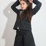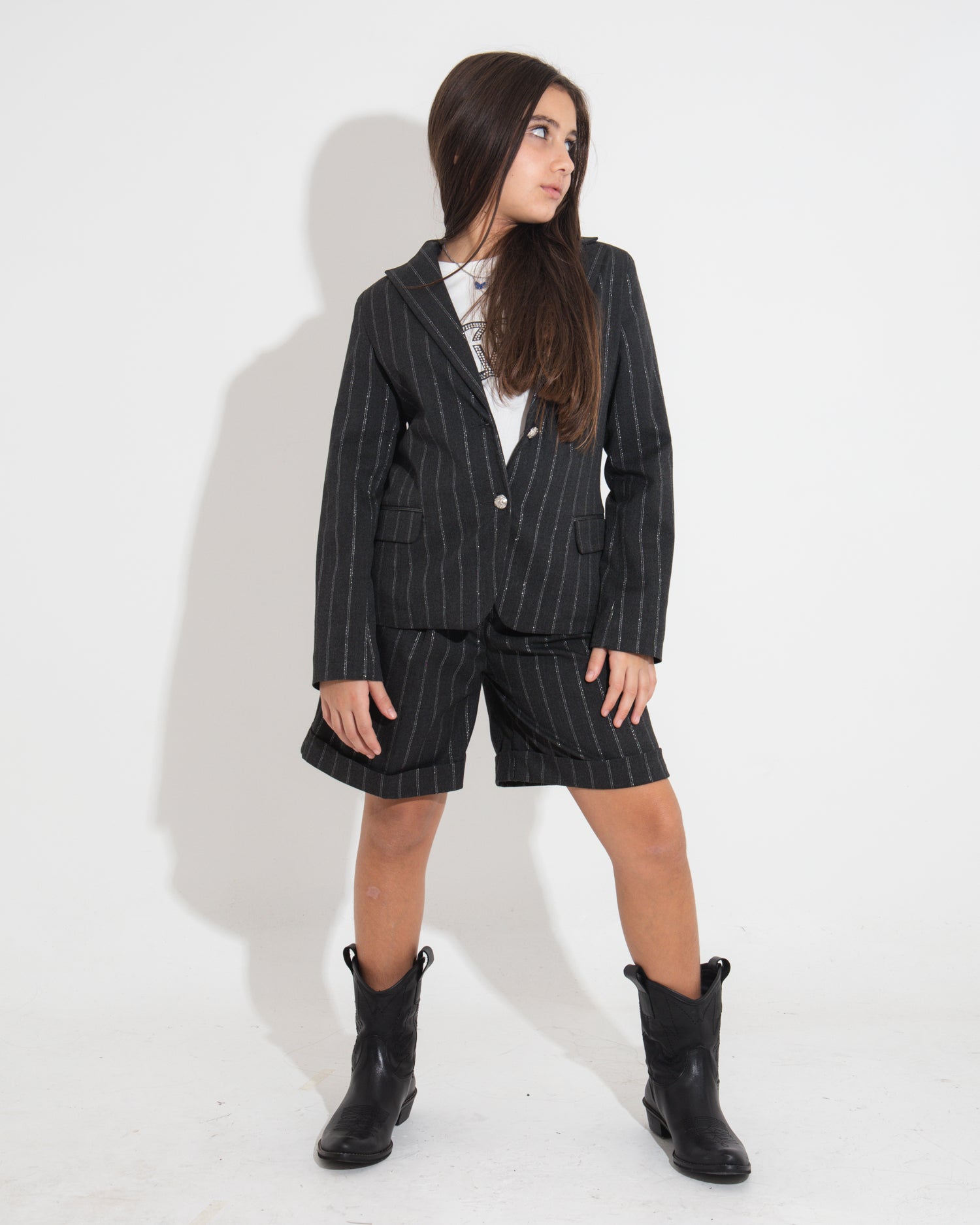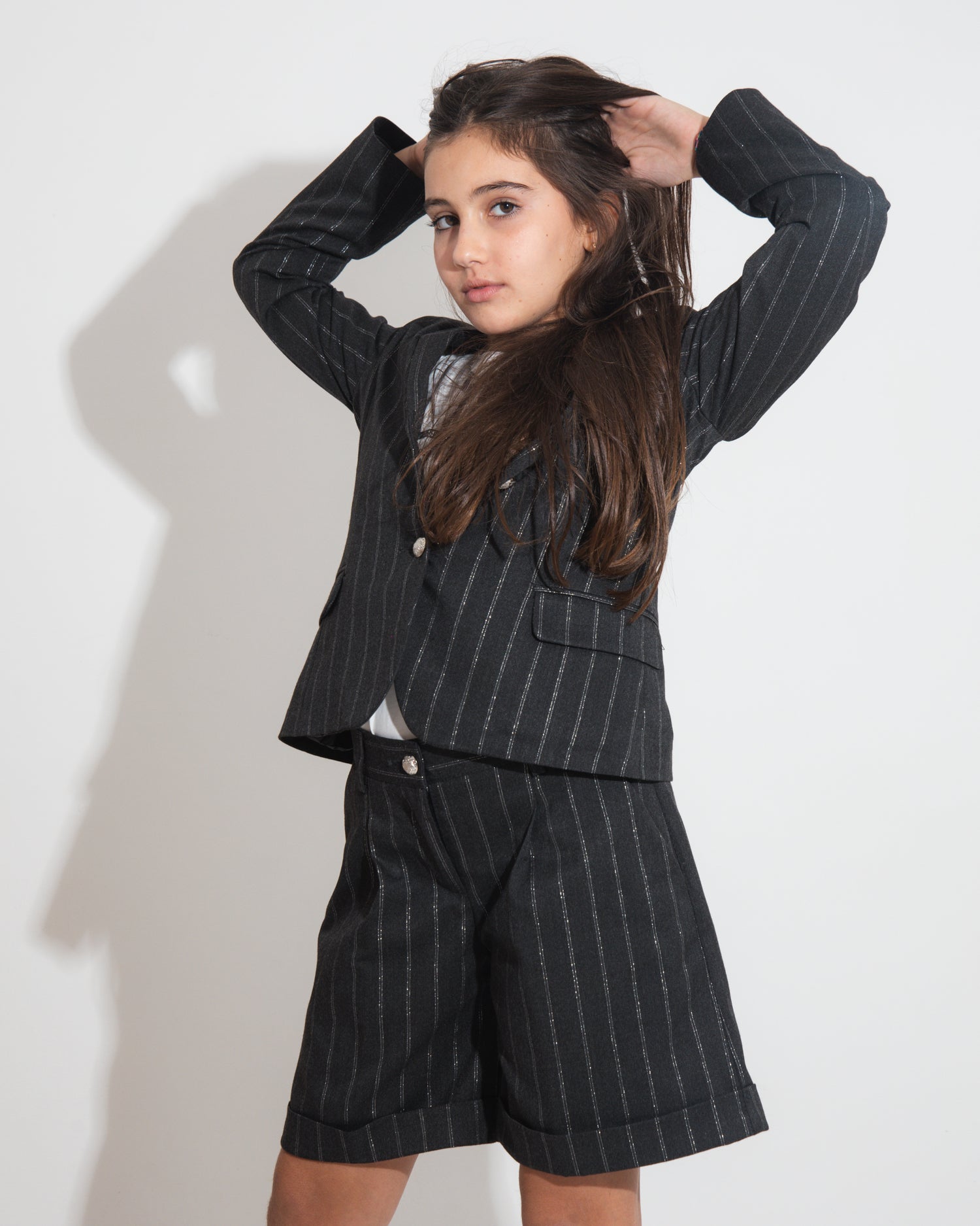 Discover the Vicolo Girls' Grey Pinstripe Shorts, perfect for a smart and casual look. With belt loops, a turn-up and convenient pockets, these shorts can be easily paired with the matching jacket for a complete and stylish outfit. The pinstripe design adds a sophisticated touch, making them ideal for casual or semi-formal occasions. Crafted from quality materials, they offer comfort and versatility for the most chic days.