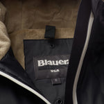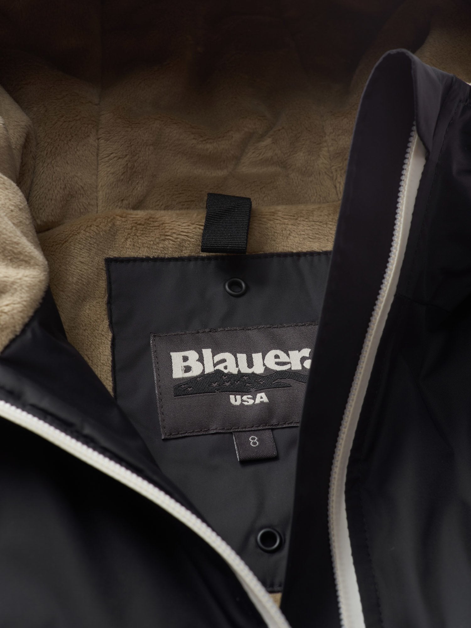 Caratteristico passante Blauer cucito sul petto a sinistra e patch Blauer con velcro e Swarovski sulla manica sinistra.