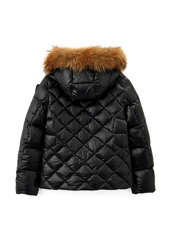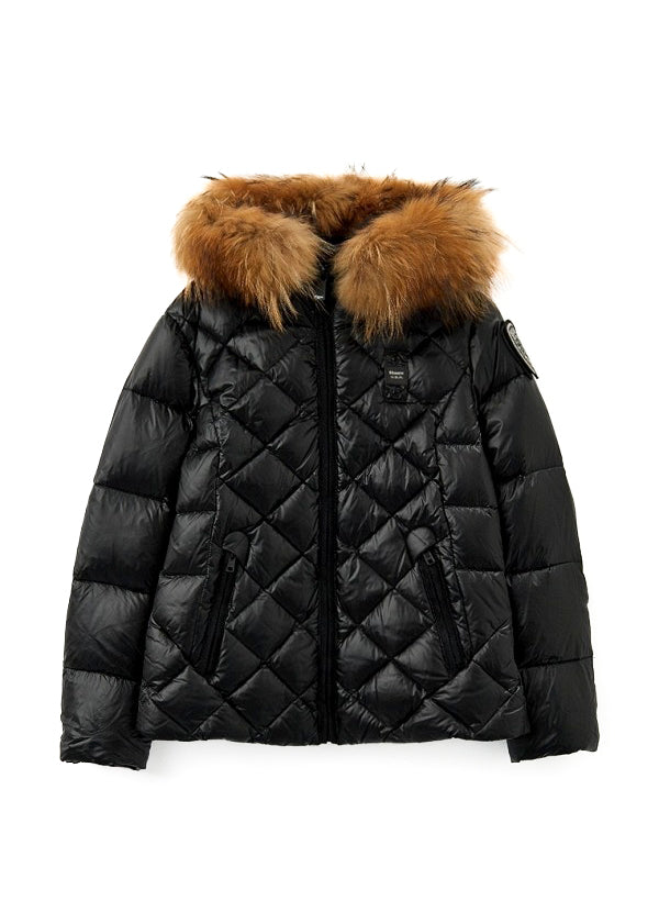 Il piumino Blauer Lotus da bambina è un capo elegante e funzionale, realizzato in tessuto di poliammide trapuntato a rombi con imbottitura in piuma. Questo piumino di media lunghezza presenta un cappuccio fisso con bordo in pelliccia naturale di procione, che aggiunge un tocco di lusso. La chiusura centrale con cursore e le tasche a filo con zip a scomparsa assicurano praticità e stile. Il fondo regolabile con stopper laterali interni consente una vestibilità perfetta, mentre il logo scudetto con micro strass applicato con velcro sulla manica e il passante logato sul petto esaltano l'eleganza di questo capo. Imbottitura 90% piumino e 10% piuma per un calore ottimale.