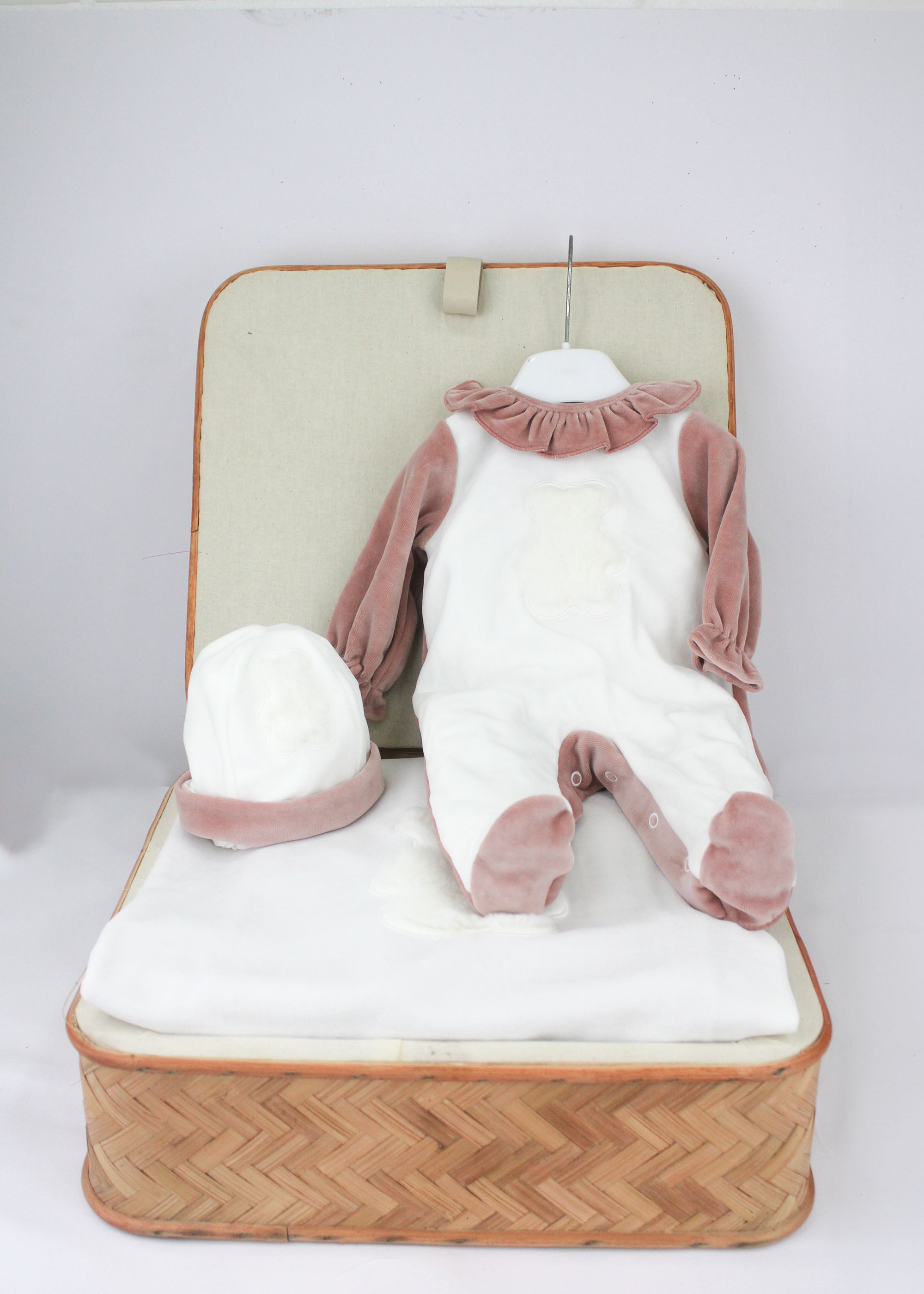 Il completo Deolinda per neonati in terracotta e bianco è un set completo e tenero che offre comfort e stile al tuo piccolo. Include una tutina in ciniglia con colletto a contrasto, cappellino abbinato con orsetto ricamato, e una copertina in morbida ciniglia con orsetto e bordo a contrasto. I dettagli delicati e i ricami di alta qualità rendono questo set perfetto per il tuo amore, un must-have per ogni neonato. Eleganza e comfort si uniscono per creare un corredino irresistibile, ideale per le prime coccole.