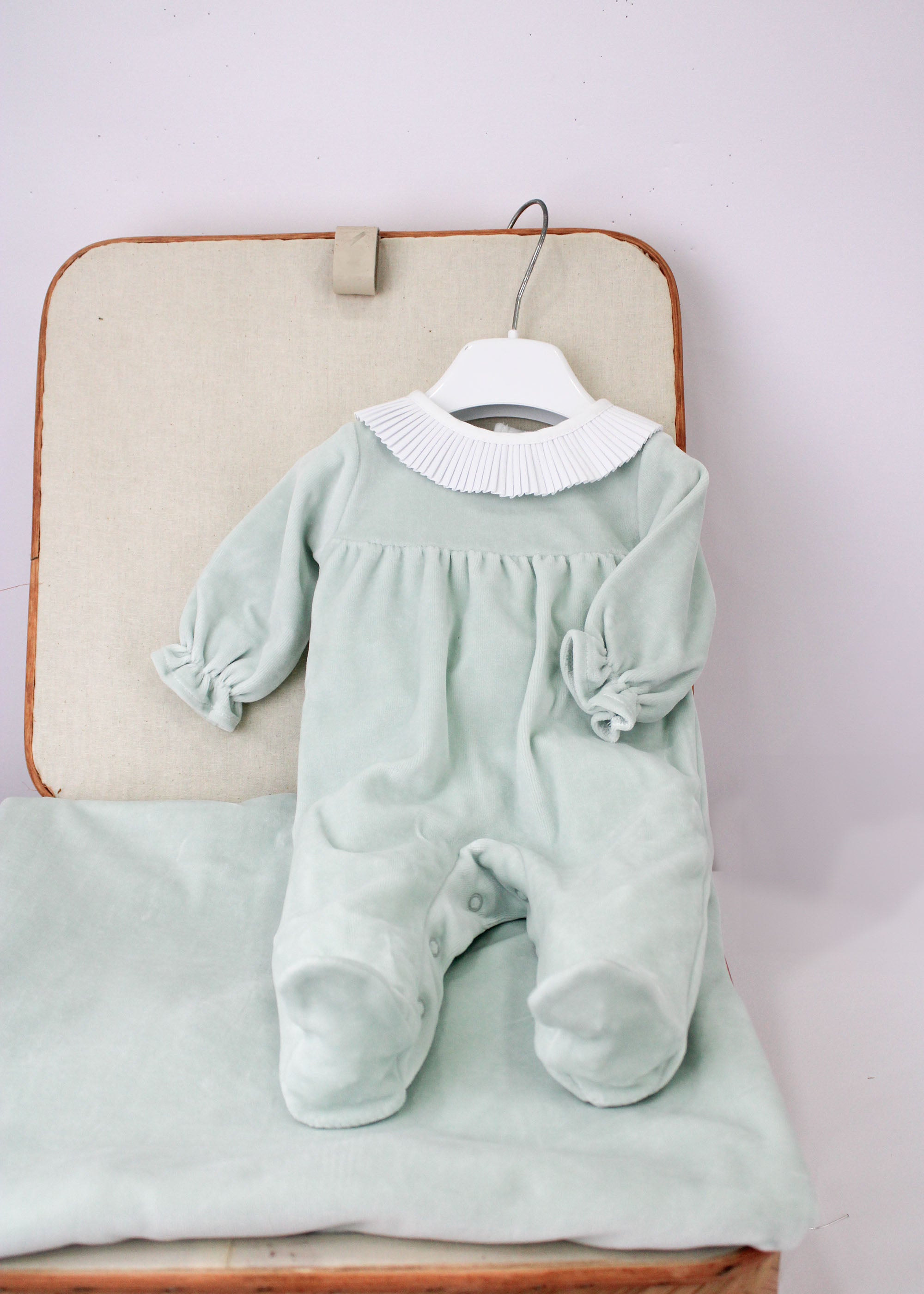 Il completo Deolinda per neonate in verde è l'ideale per le prime coccole. Questo set include una tutina con colletto a pagliaccio in contrasto, abbottonatura a pressione e piedini, una coperta morbida con bordino a contrasto, e un cappellino coordinato. Il delicato colore verde menta, unito ai dettagli di alta qualità, rende questo corredino perfetto per ogni occasione. Un set elegante e confortevole, che avvolge il tuo piccolo con tenerezza e stile.