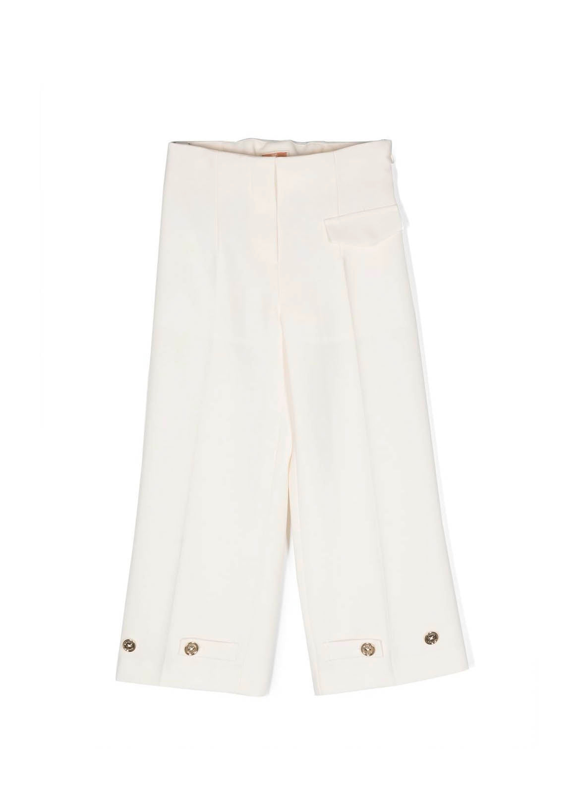 Pantaloni con piega stirata e dettaglio di bottoni Colore bianco avorio, dettaglio decorativo con doppio bottone, piega stirata, vita alta, tasca laterale con patta e orlo dritto.